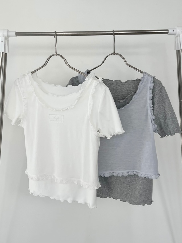 【POINT】 トレンドのレイヤードコーデが完成できるhugiらしい1着。 ベーシックなカラー展開で、どんなコーディネートにも馴染みやすく、着回し抜群です。 裾、袖、襟元に施されたメロウフリルがさりげなくフェミニンなアクセントをプラスしてくれます。 ※商品の着用方法や取り扱いについては、付属の注意書きを必ずご確認ください。 素材の特性により、写真と実物の色や質感が若干異なる場合がありますのでご了承ください。 【SIZE】FREE ≪半袖≫ 身丈 52cm 身幅 39cm 肩幅 37cm 袖丈 18cm AH 18cm ≪キャミソール≫ 身丈 44cm 身幅 40cm 肩幅 29cm 【COLOR】 OFF WHITE GRAY 【FABRIC】 ≪半袖≫ ポリエステル 64% レーヨン 27% ポリウレタン 9% ≪タンクトップ≫ テンセル 100% 透け感 Tシャツ:若干あり/タンクトップ:あり 光沢感 なし 裏地 なし 伸縮性 あり MADE IN CHINA 商品番号 hug0199SM