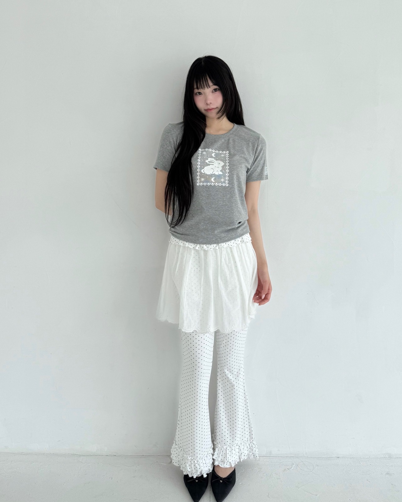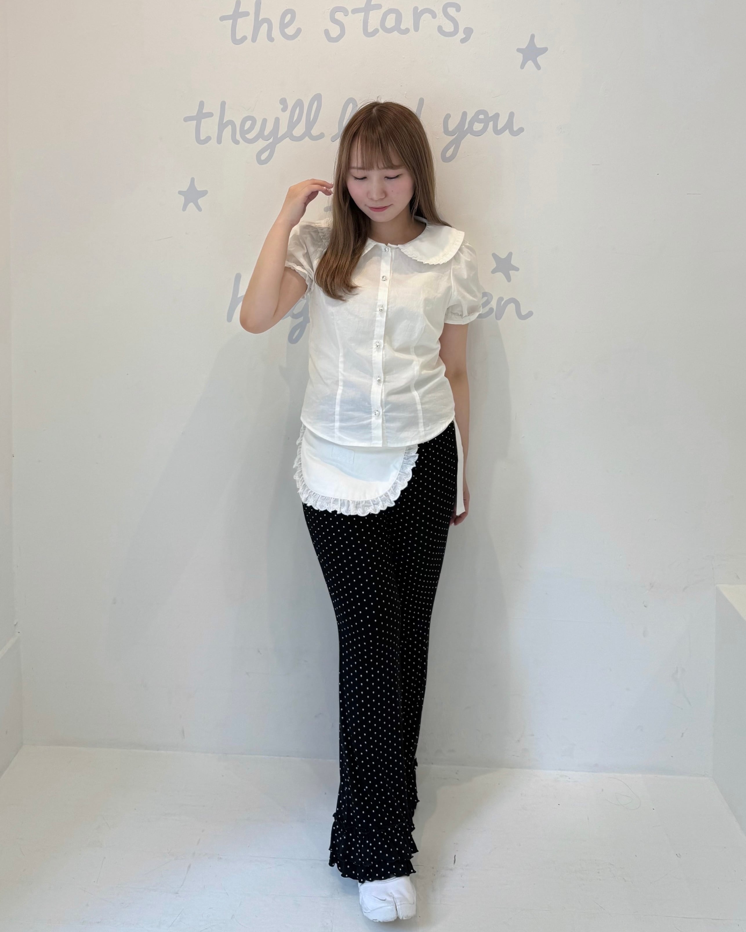ドット柄がかわいいロングパンツです。ウエスト部分と裾にはフリルが取り入れられ、ポケット上のミニリボンがワンポイントとなっています。
