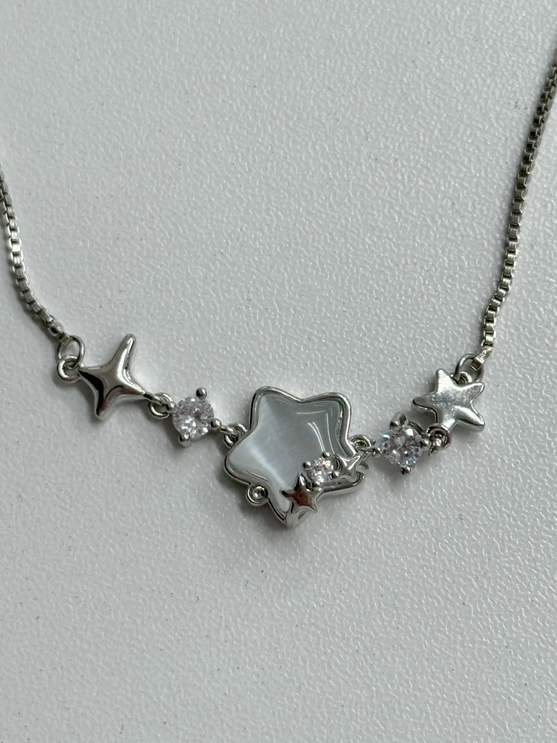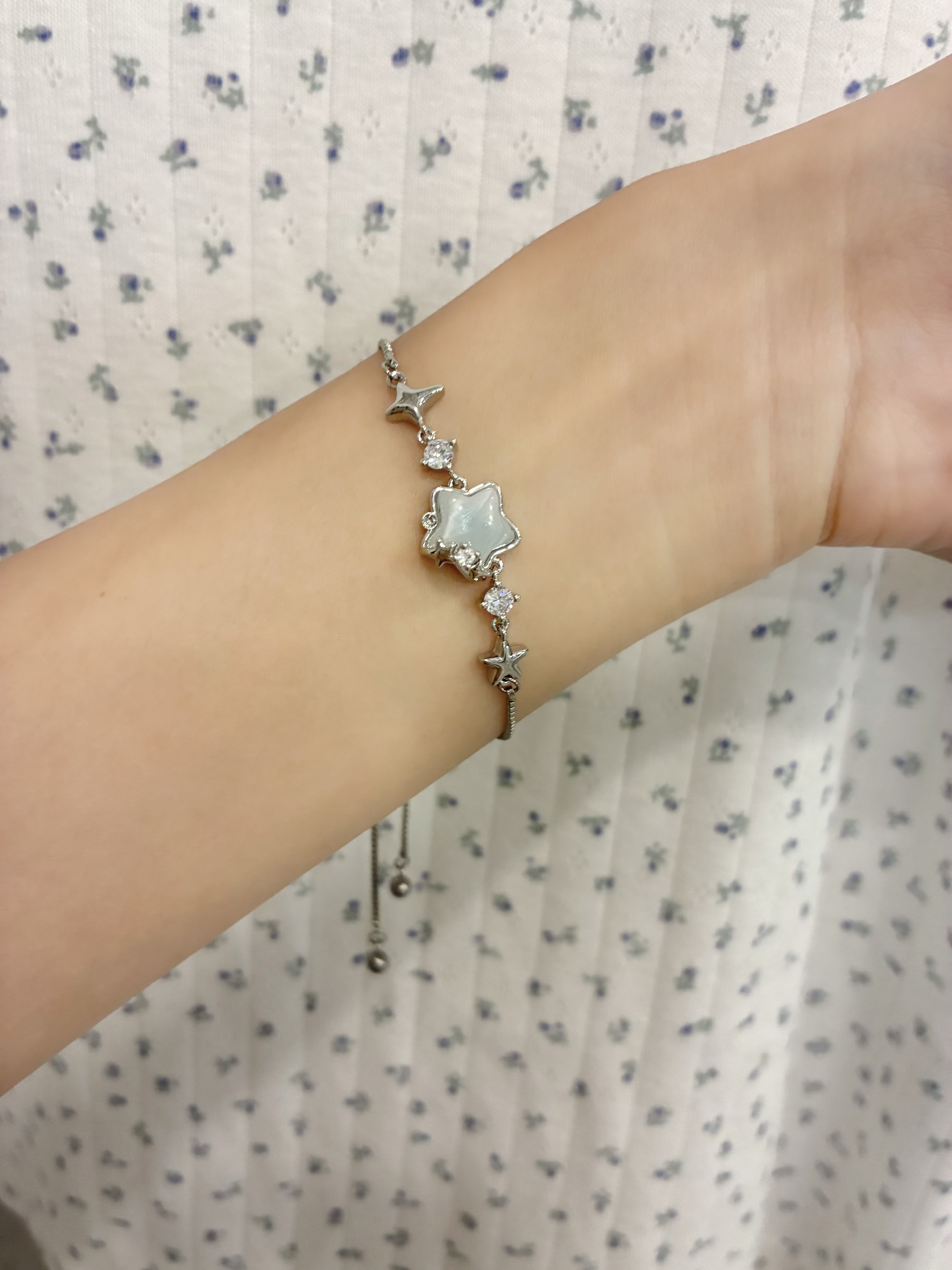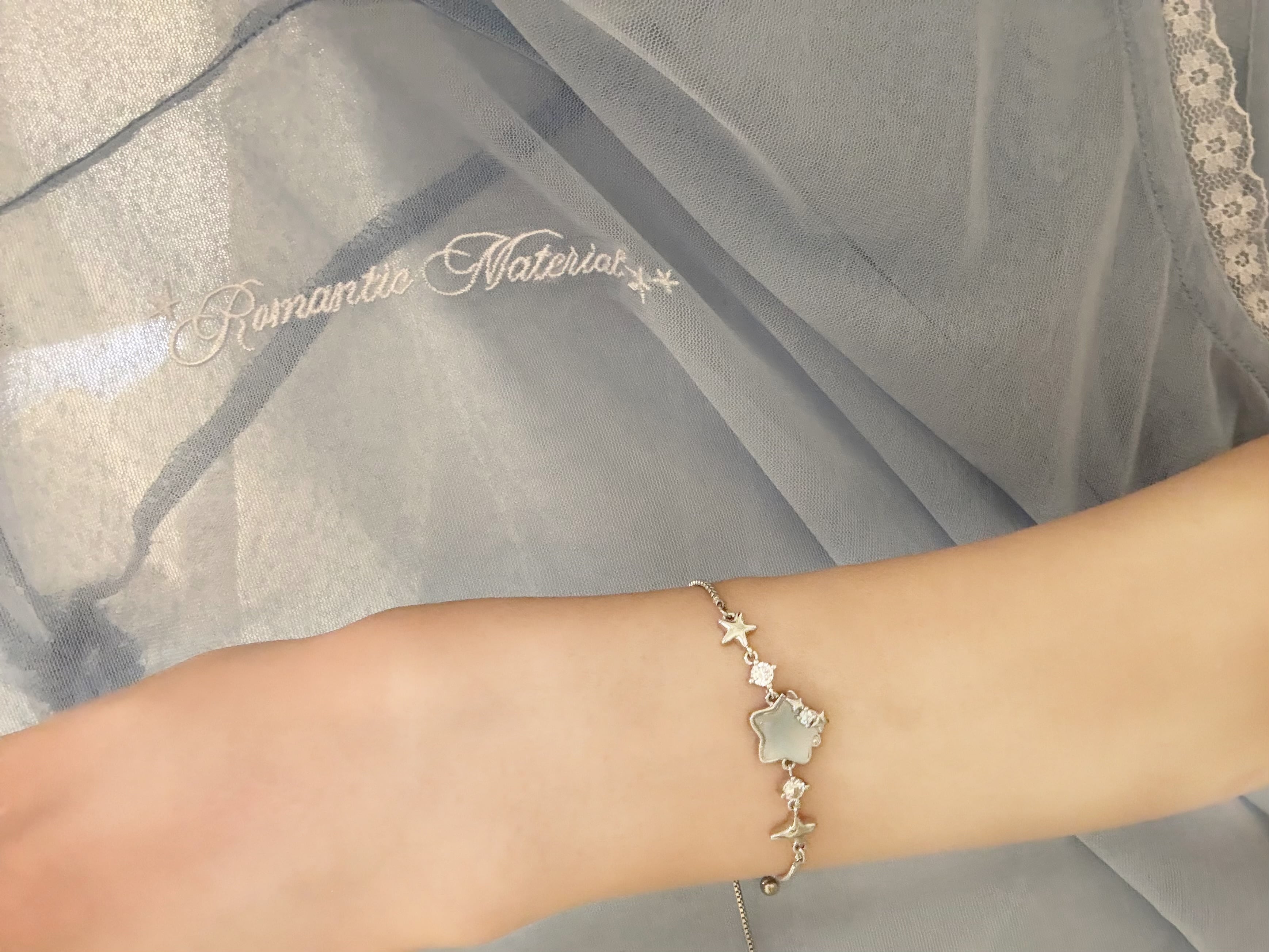 グレーブルーの星モチーフが可愛いブレスレット。ビジューやパールの装飾もあったり、PEARL STAR RINGと一緒につけても可愛いです。また、調節もしやすくなっております。