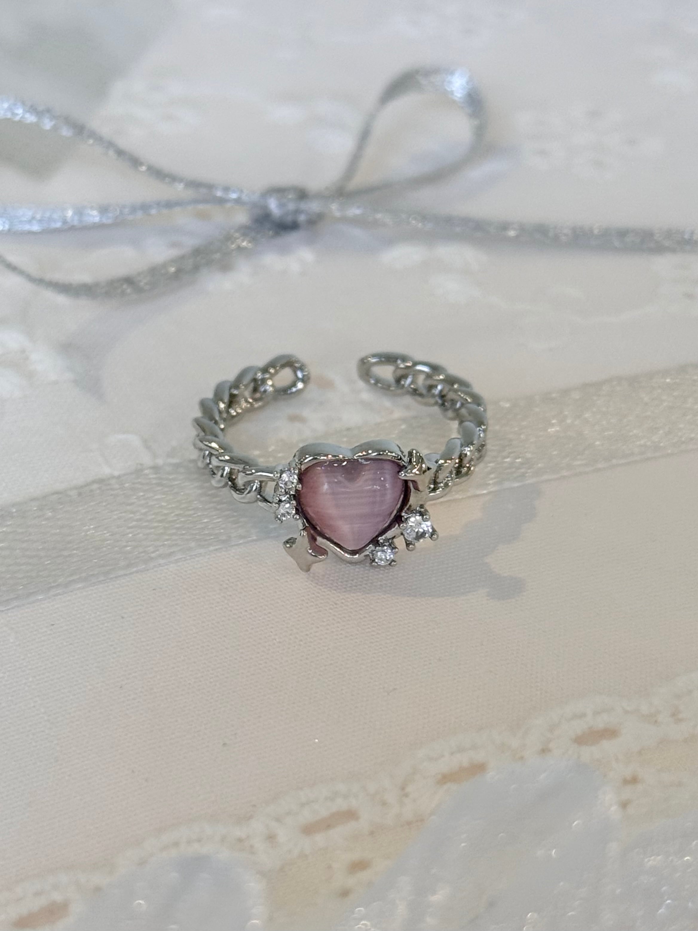 パープルみのあるピンクハートリングです。周りにはビジューが施されており、調節可能です。