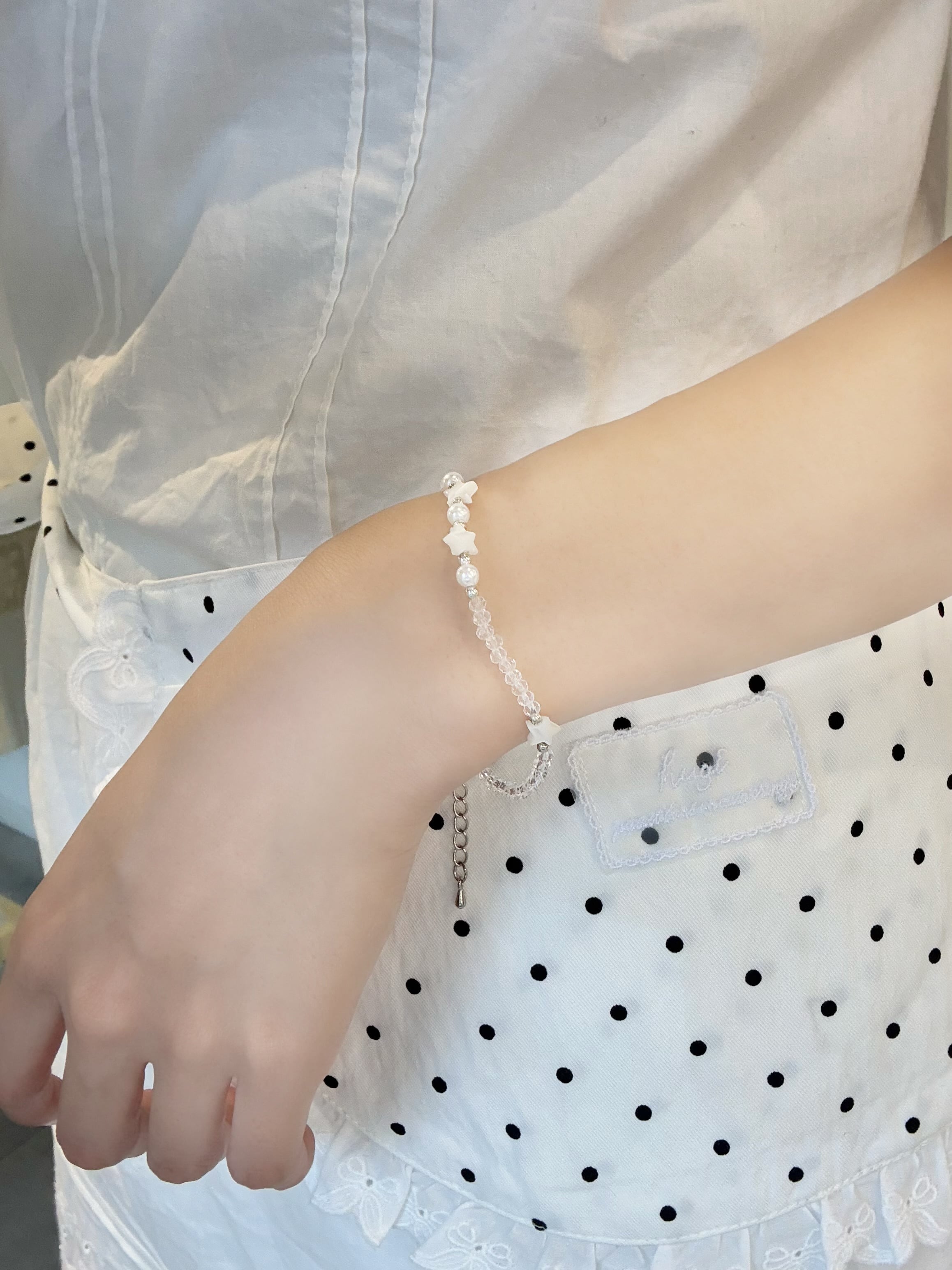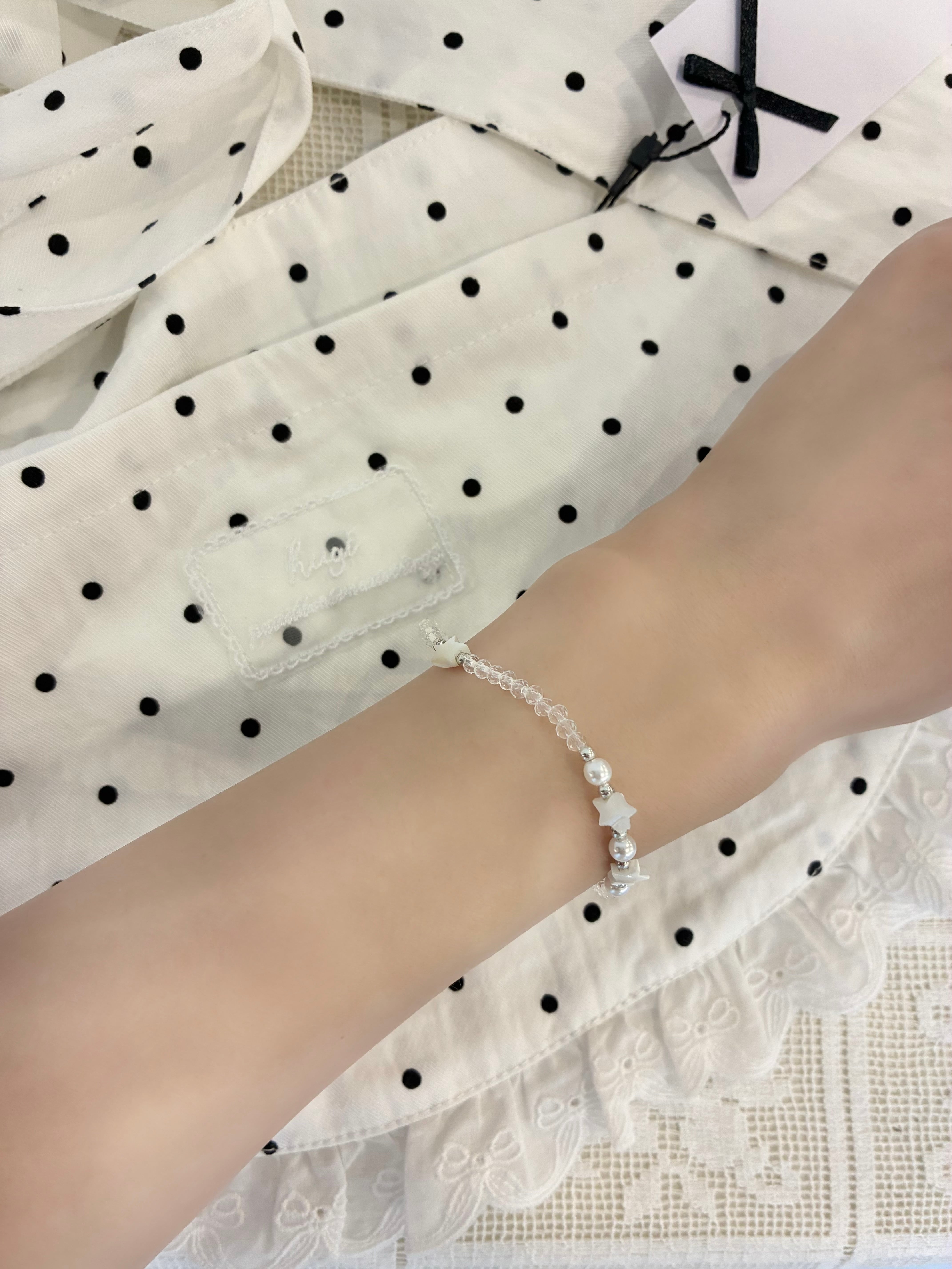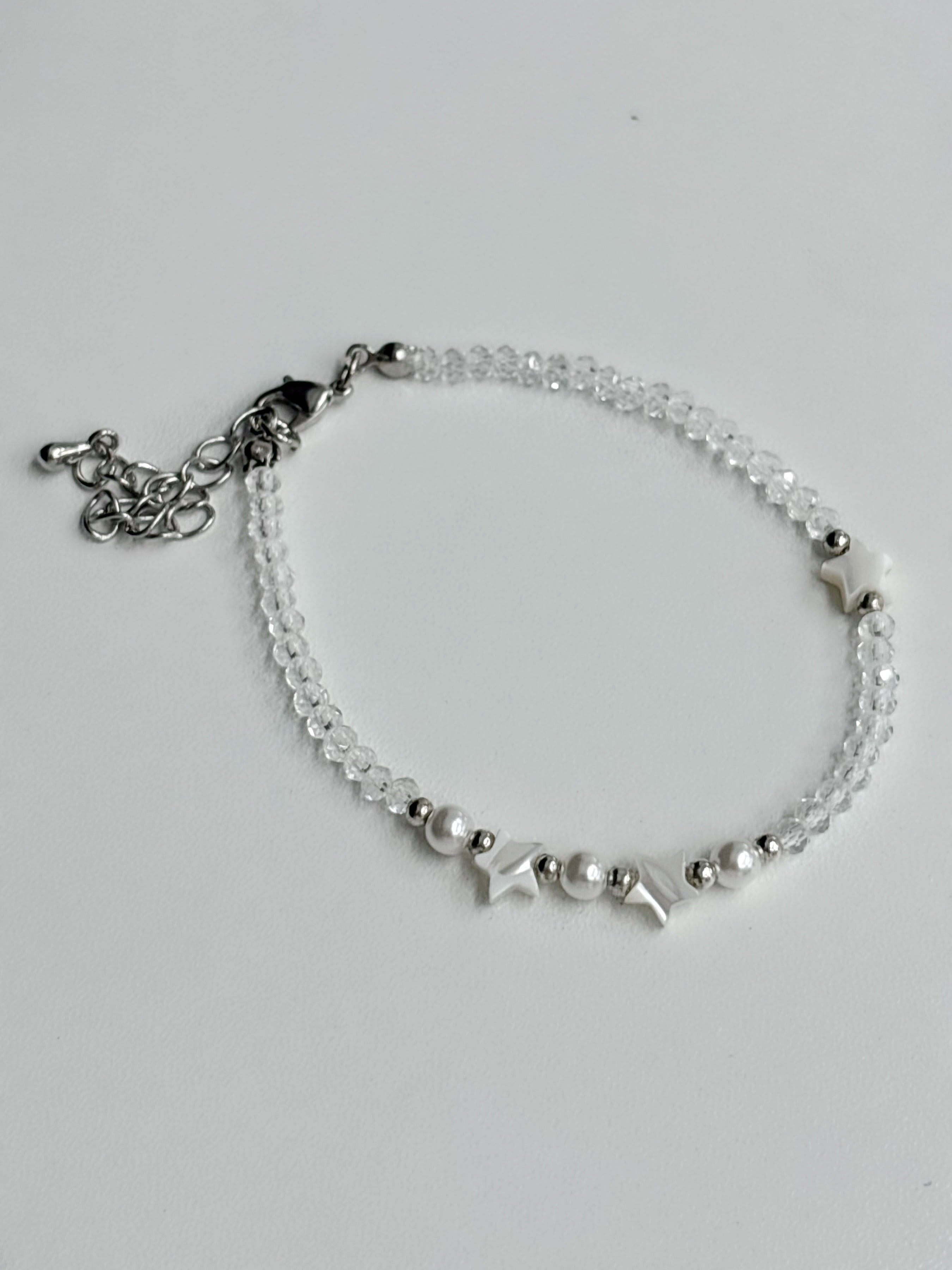 クリアビーズがベースとなったブレスレット。ホワイトカラーの星やパールが散りばめられており、どんなコーディネートにも合わせていただけます。