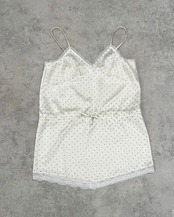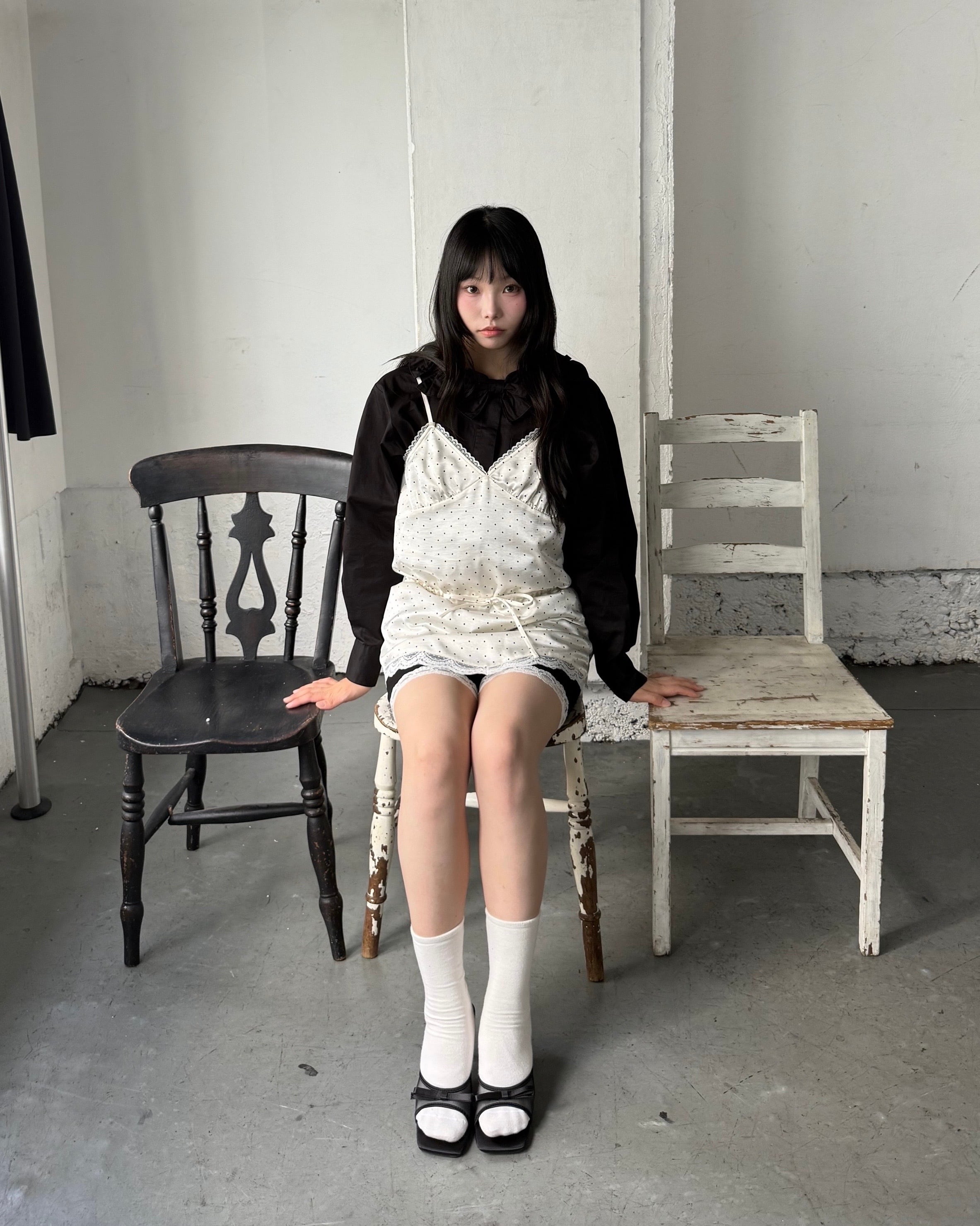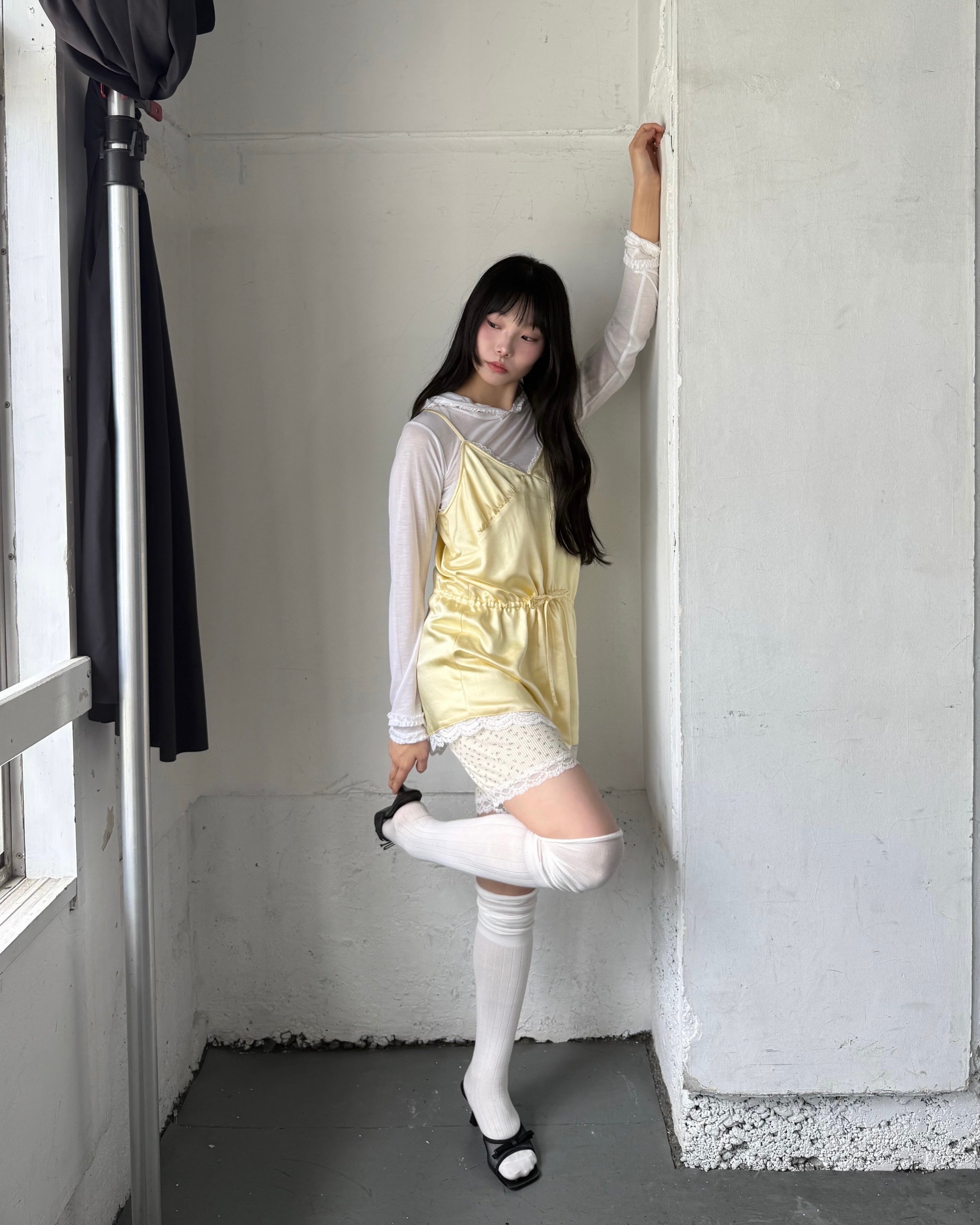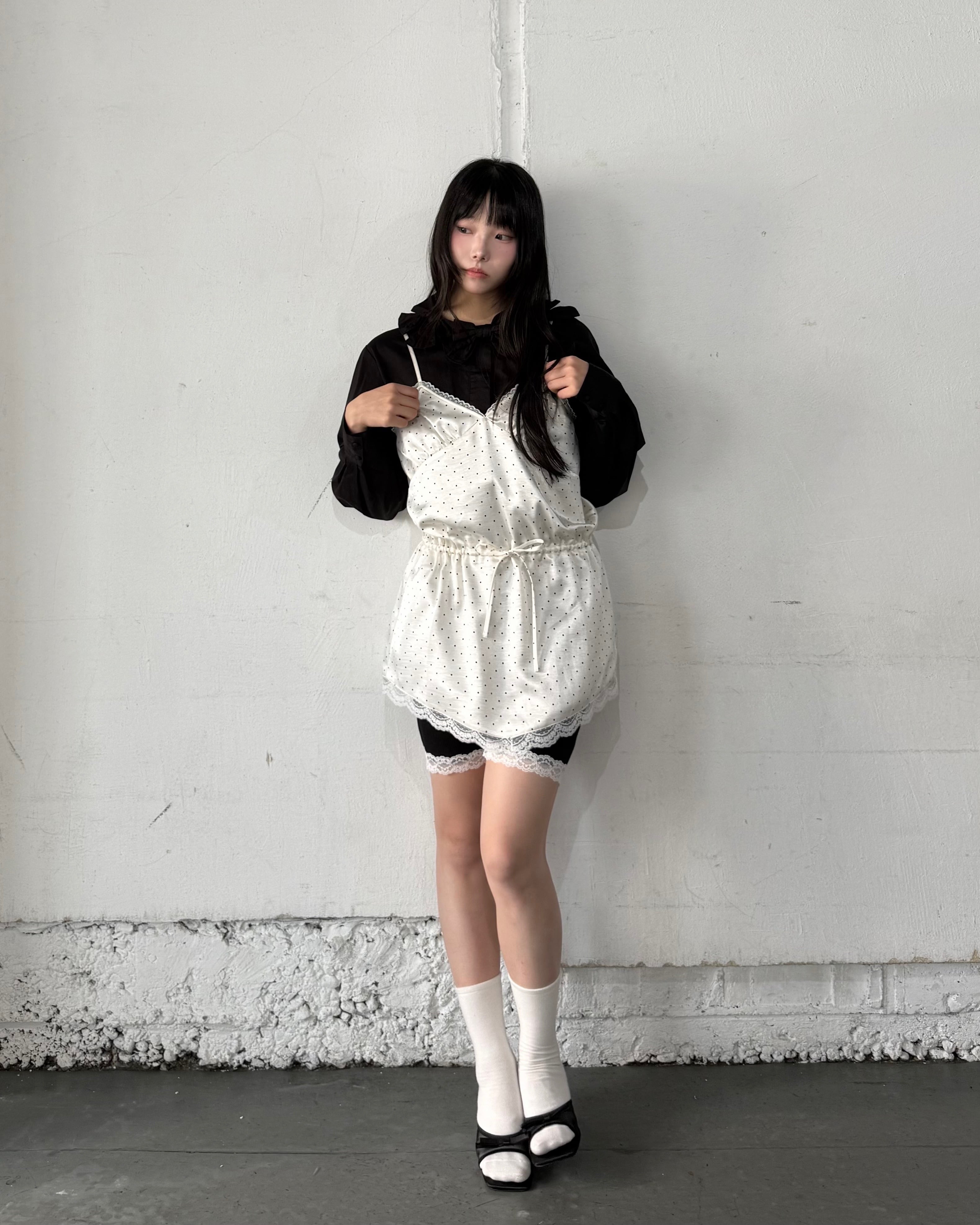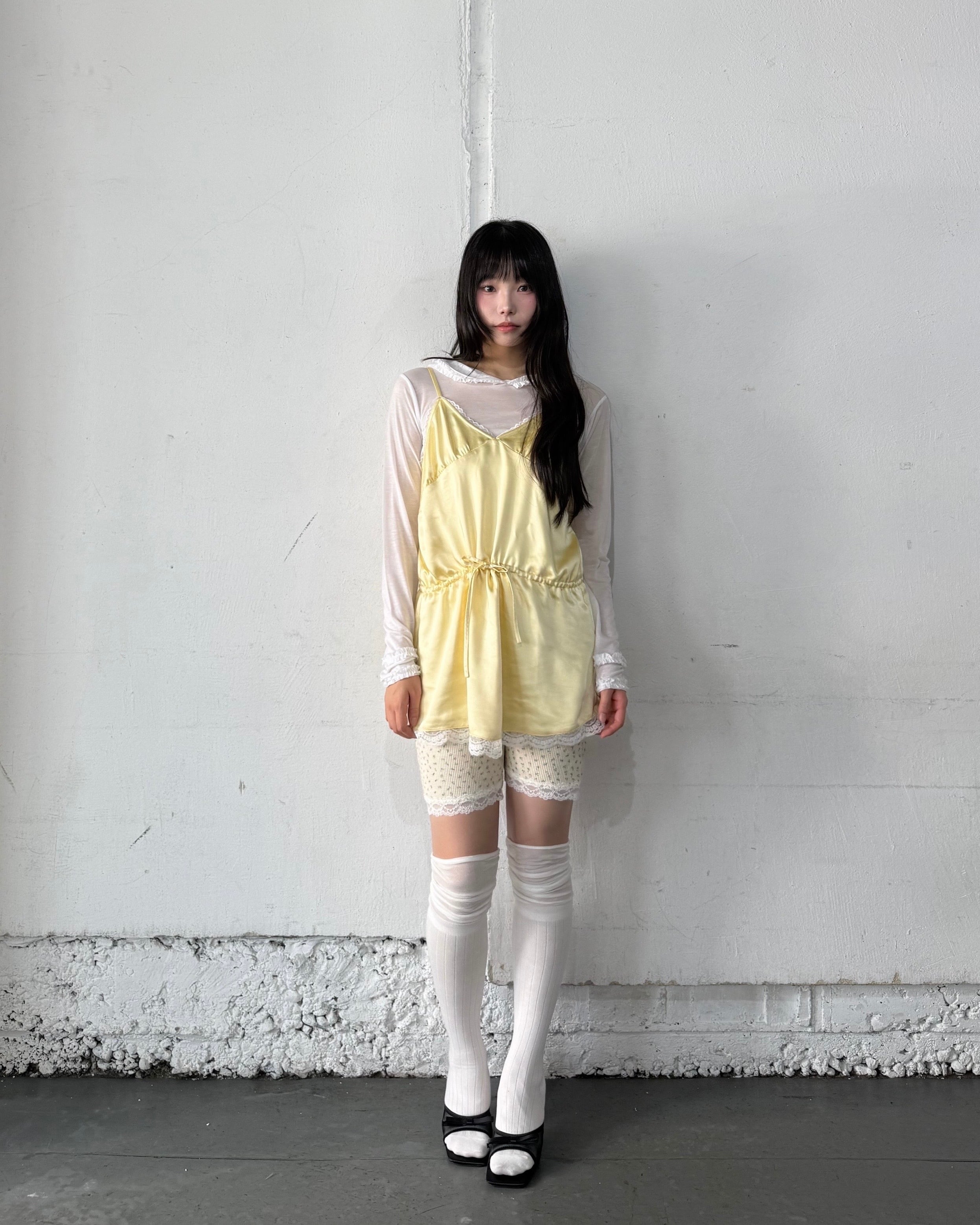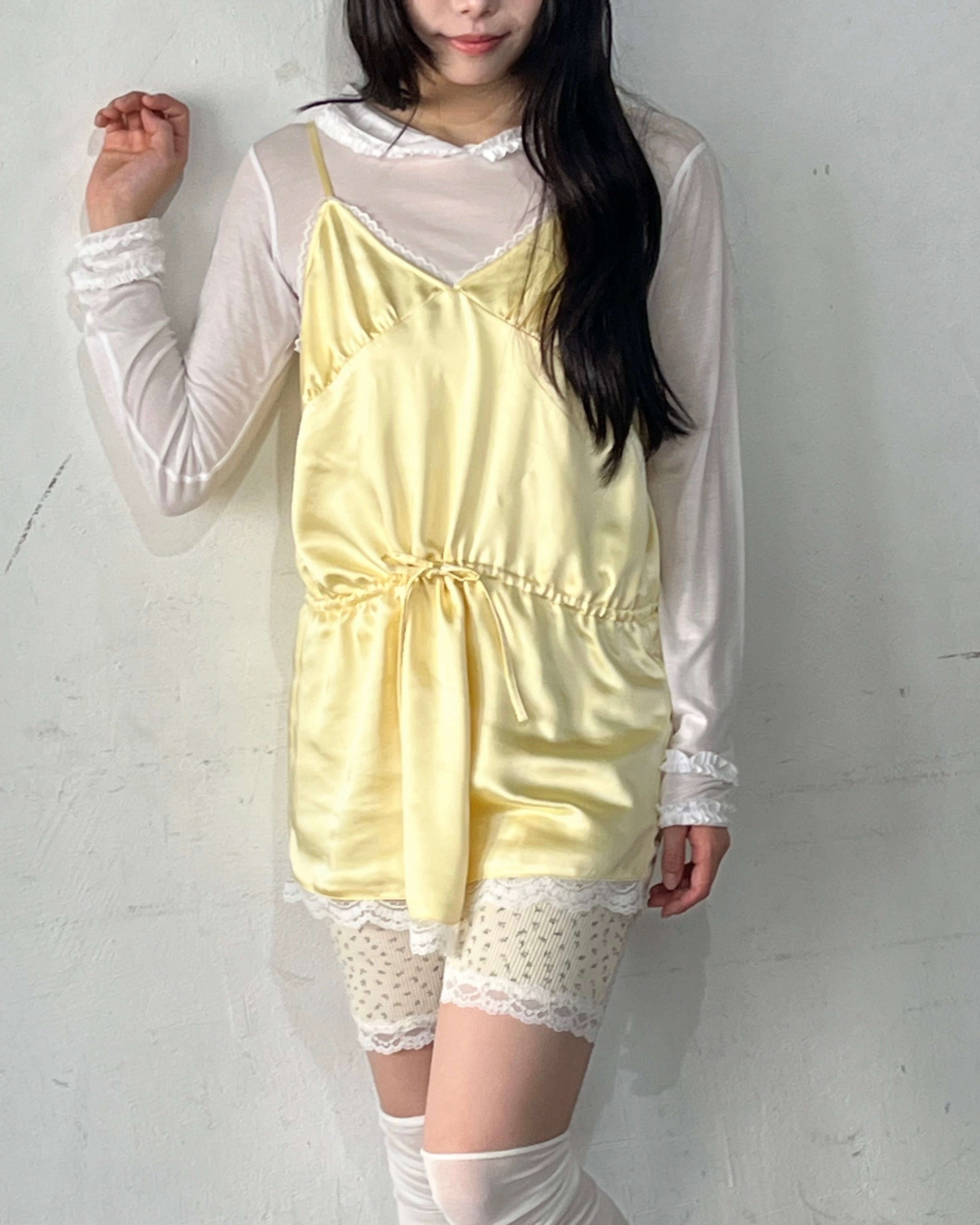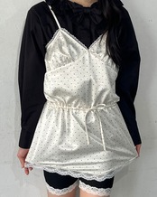 小さなピコレースをあしらったミニ丈のキャミワンピース。
