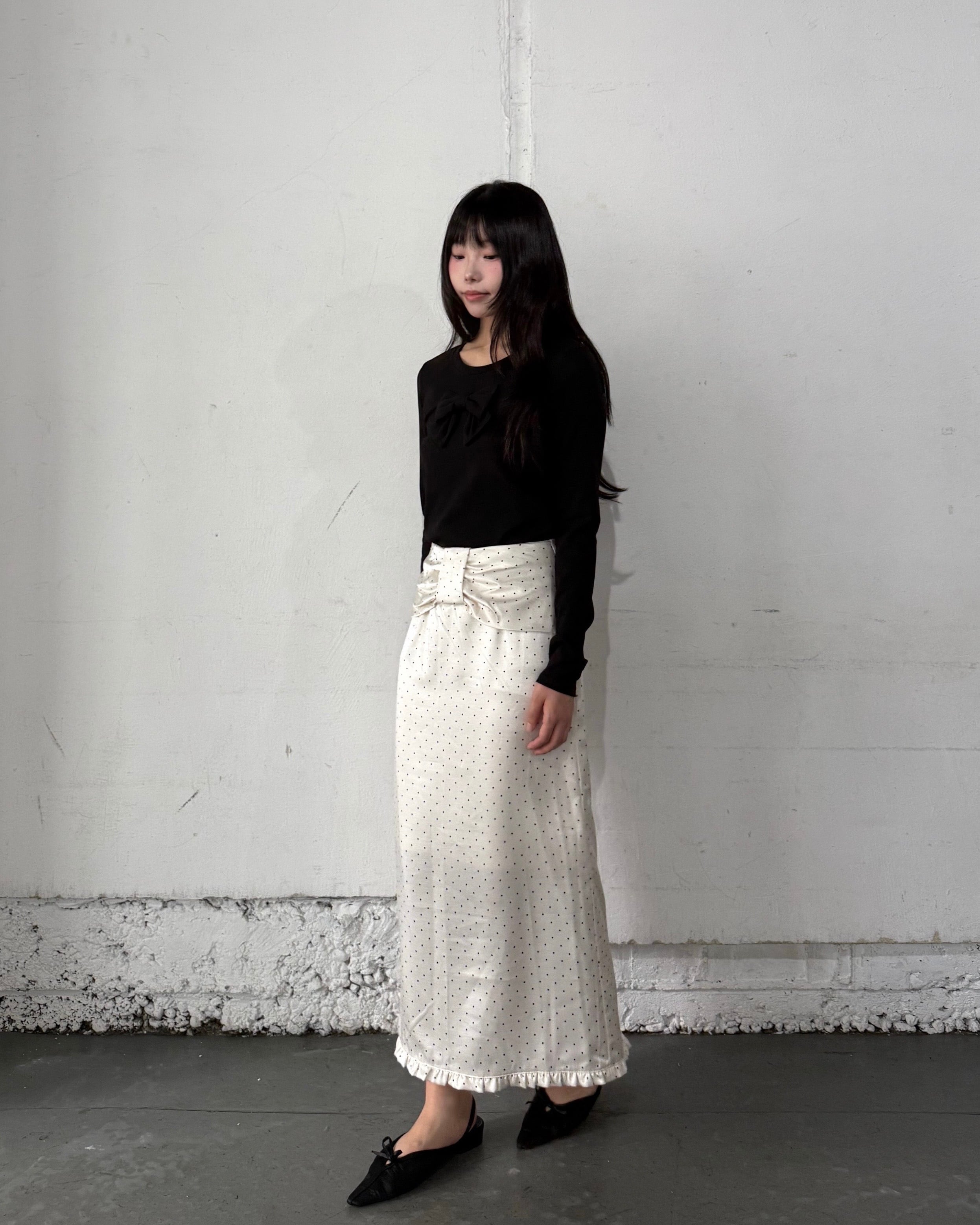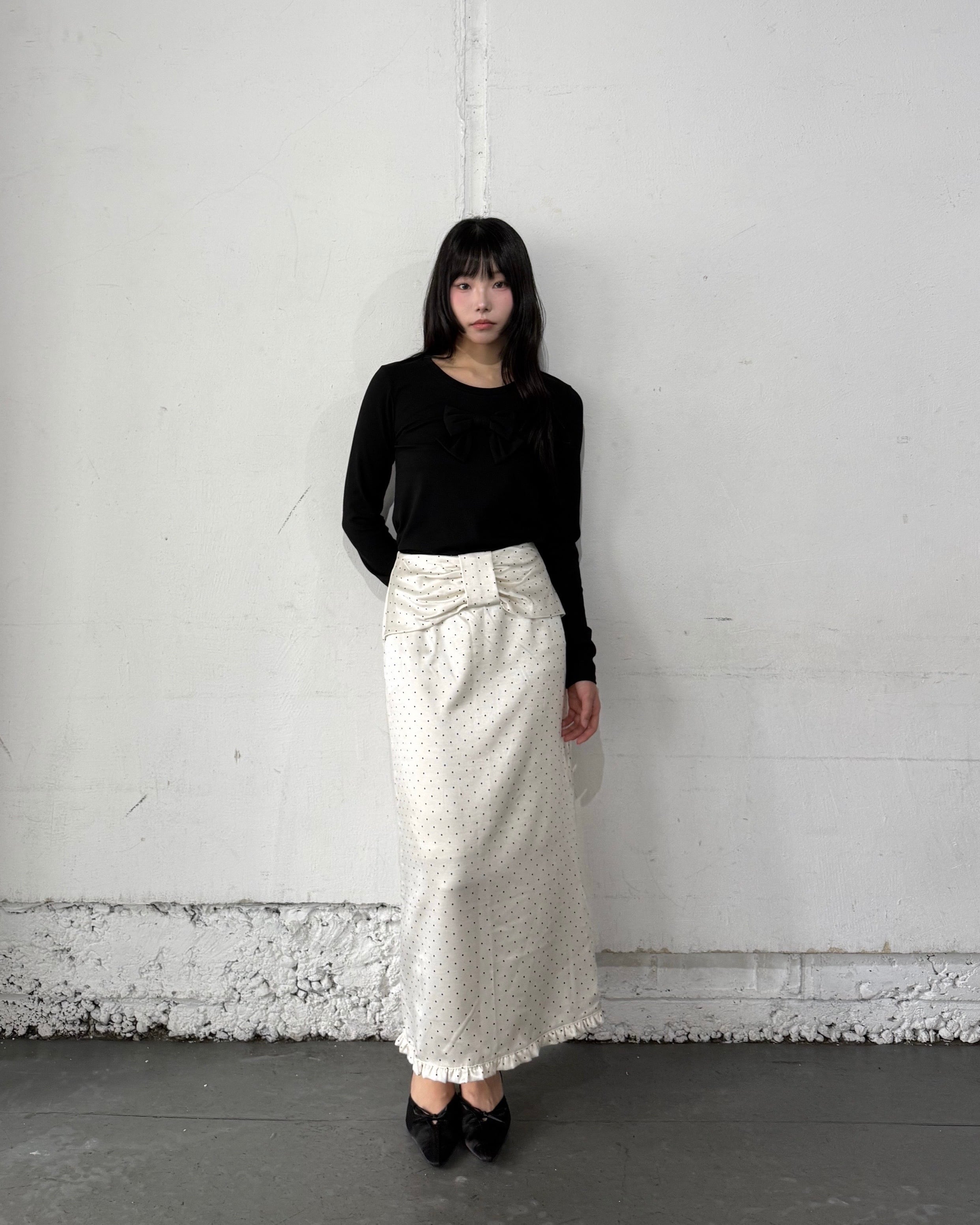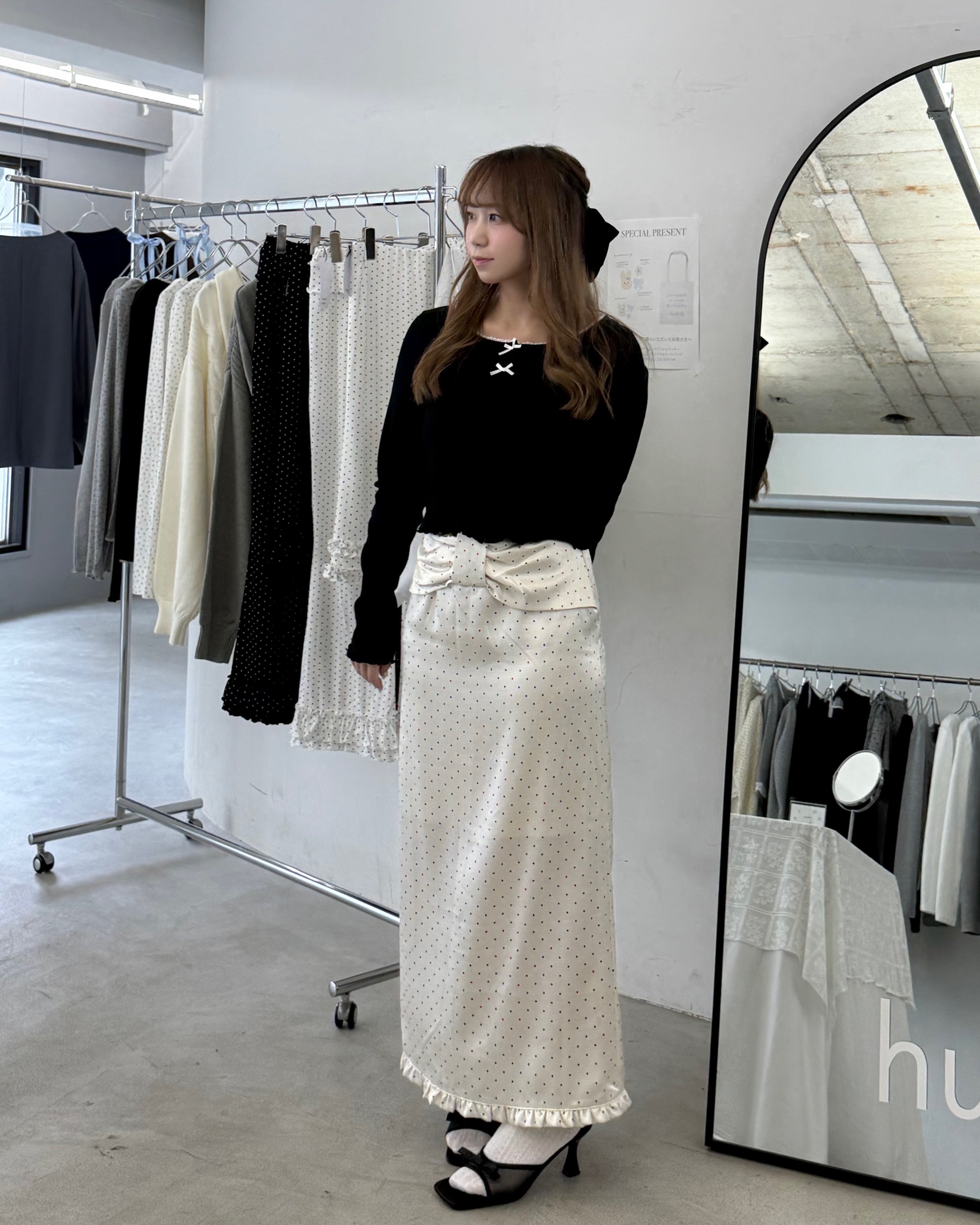 ウエスト部分には大きなリボンをあしらい、トップスをインして着れば存在感のあるポイントに。