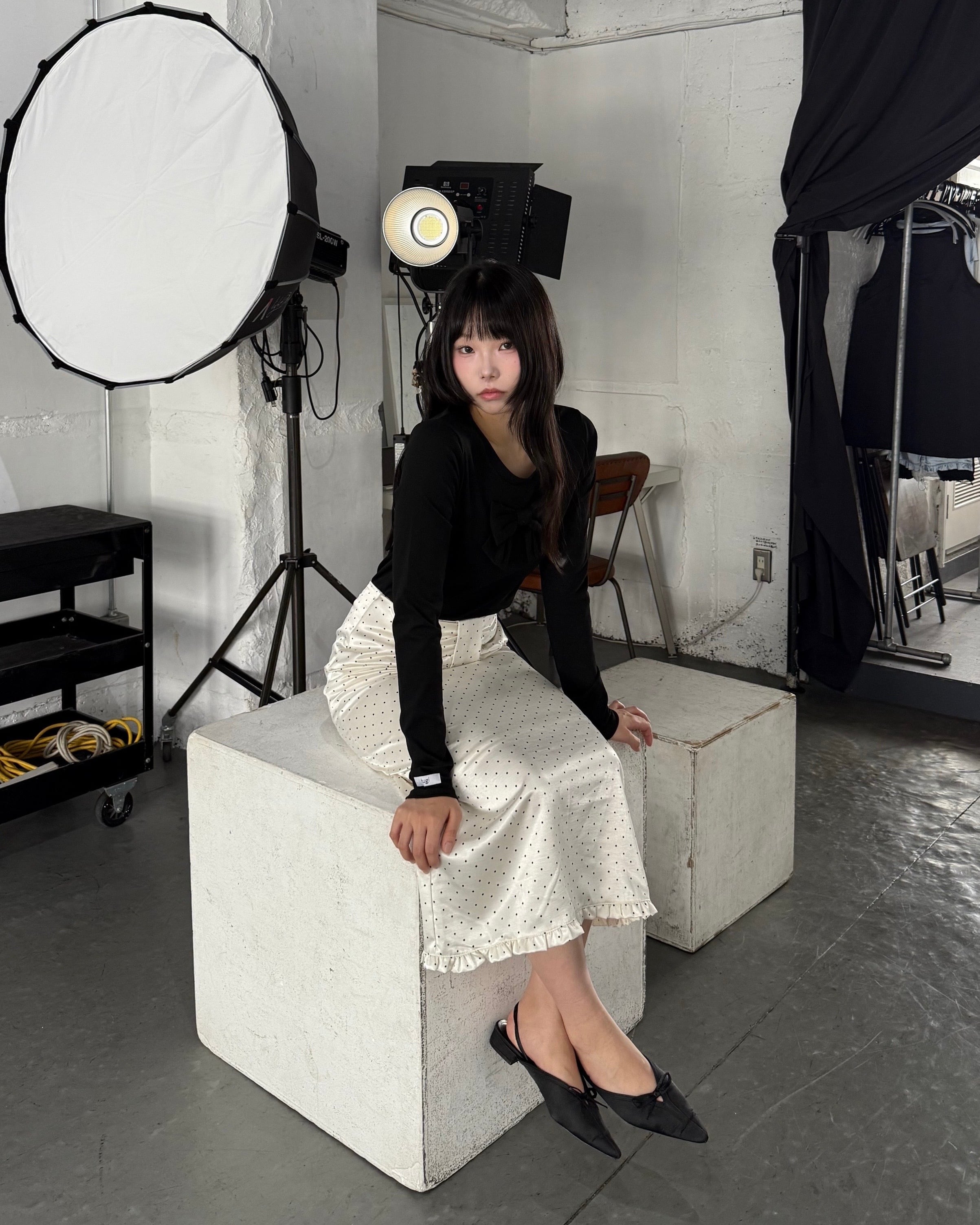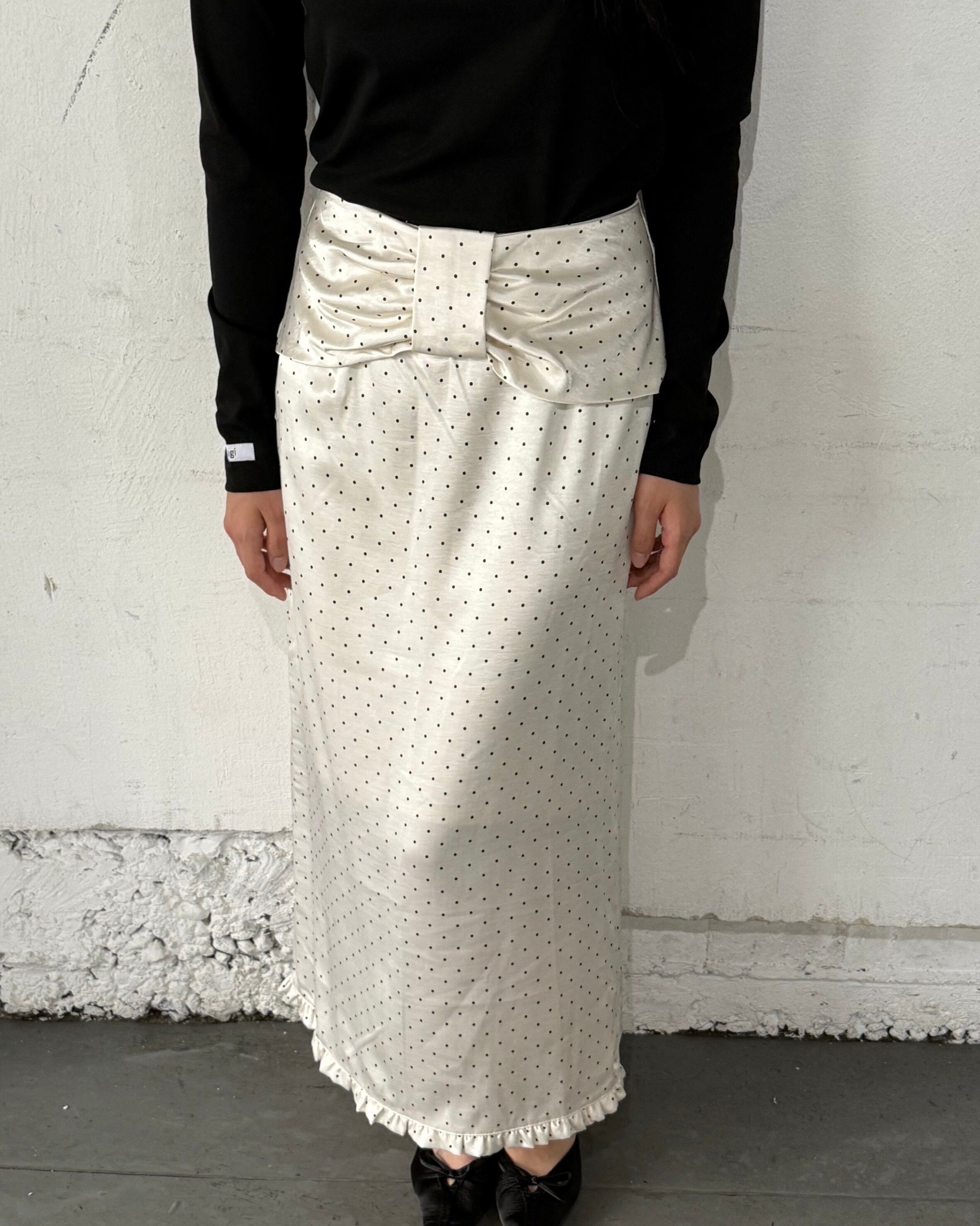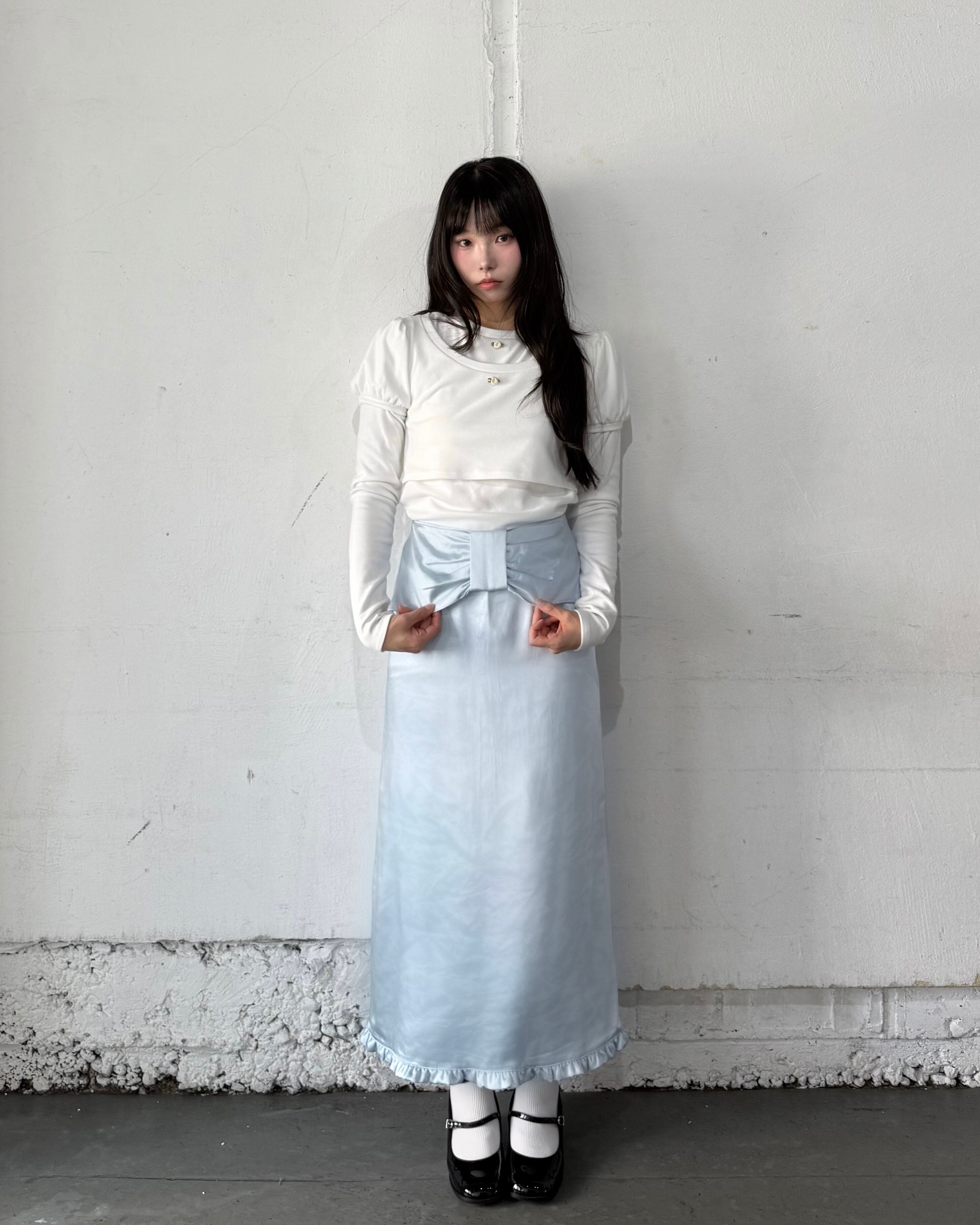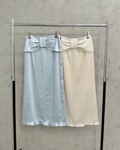 ウエスト部分には大きなリボンをあしらい、トップスをインして着れば存在感のあるポイントに。