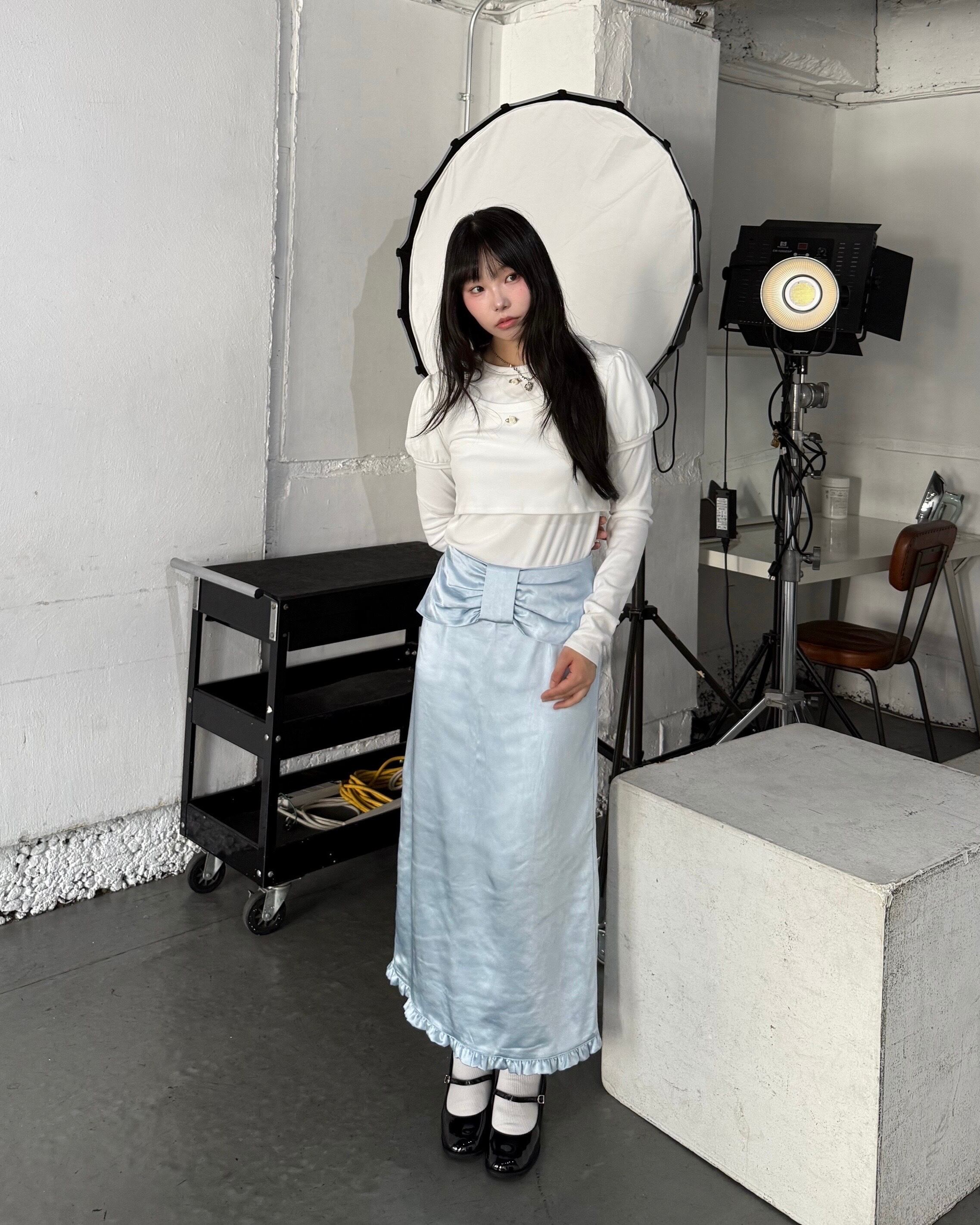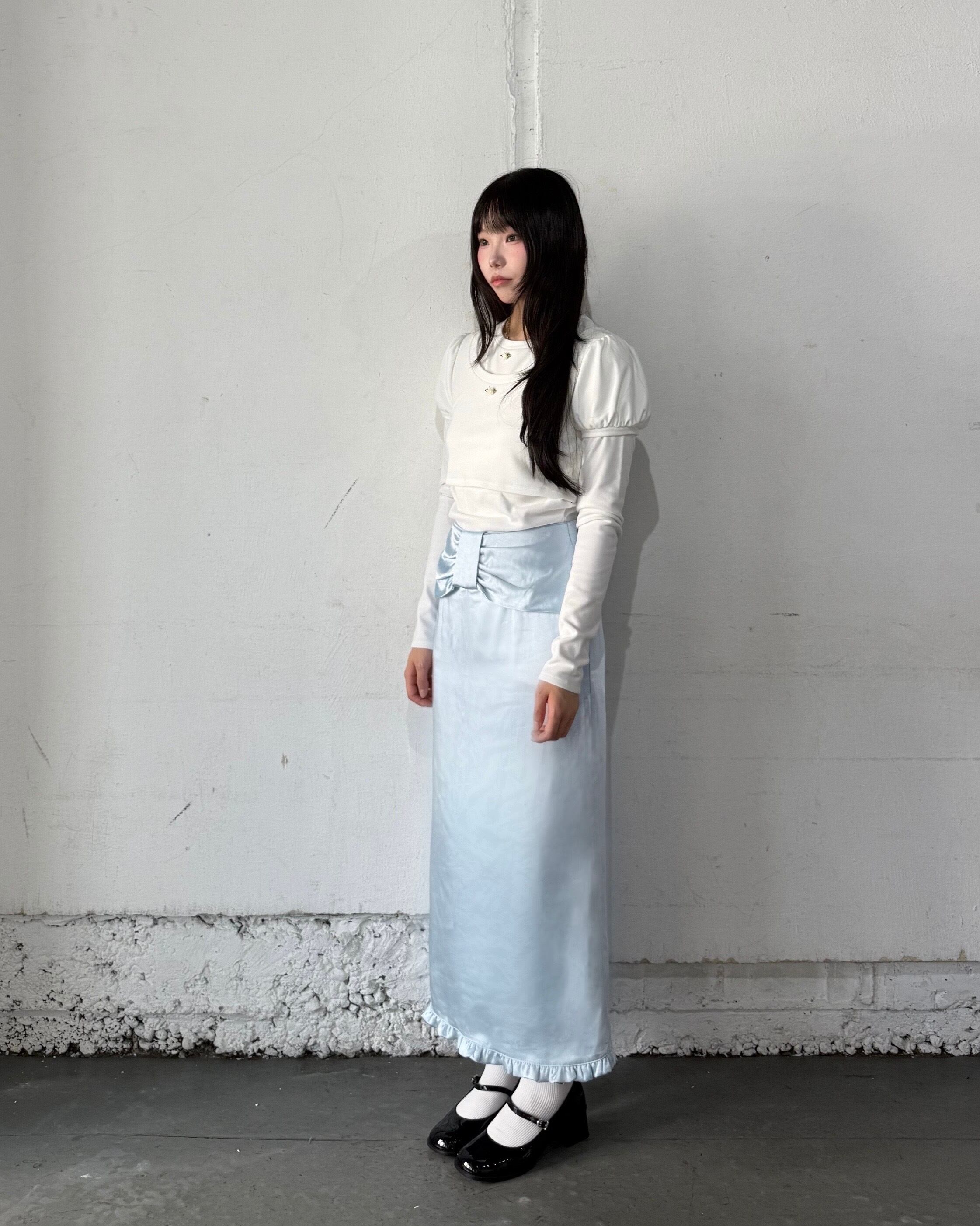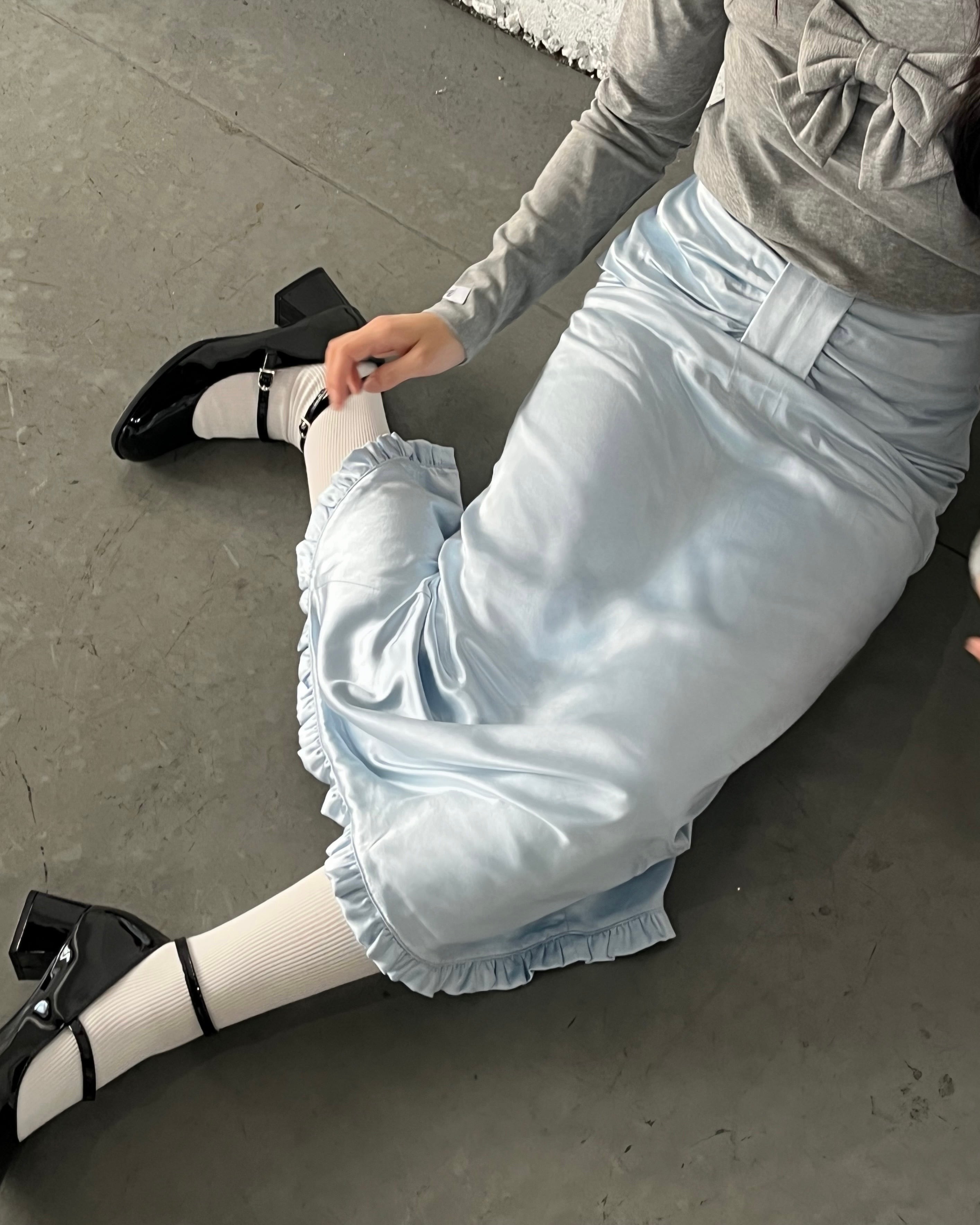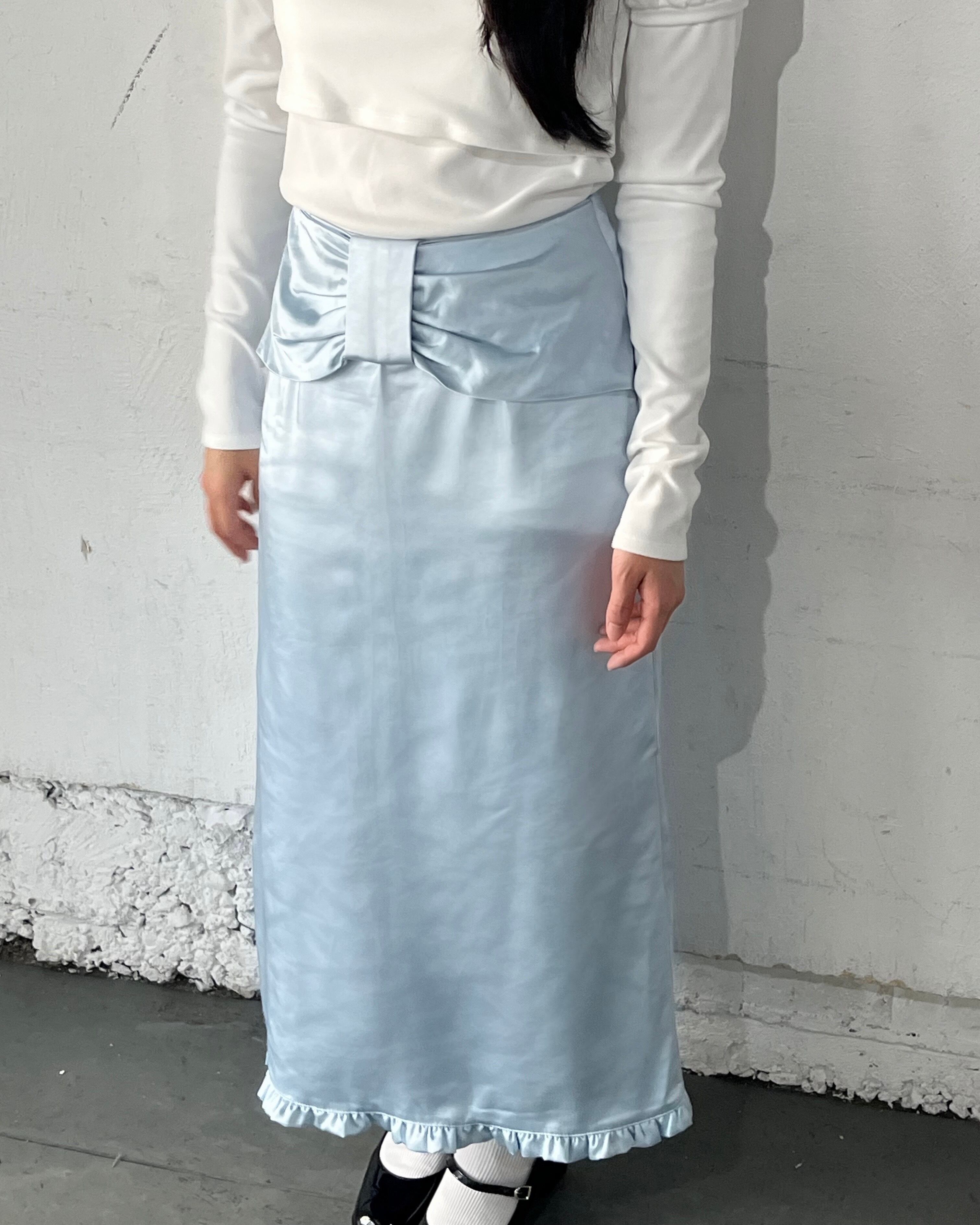 サテン生地を使用した軽やかで上品な雰囲気のロングスカート。