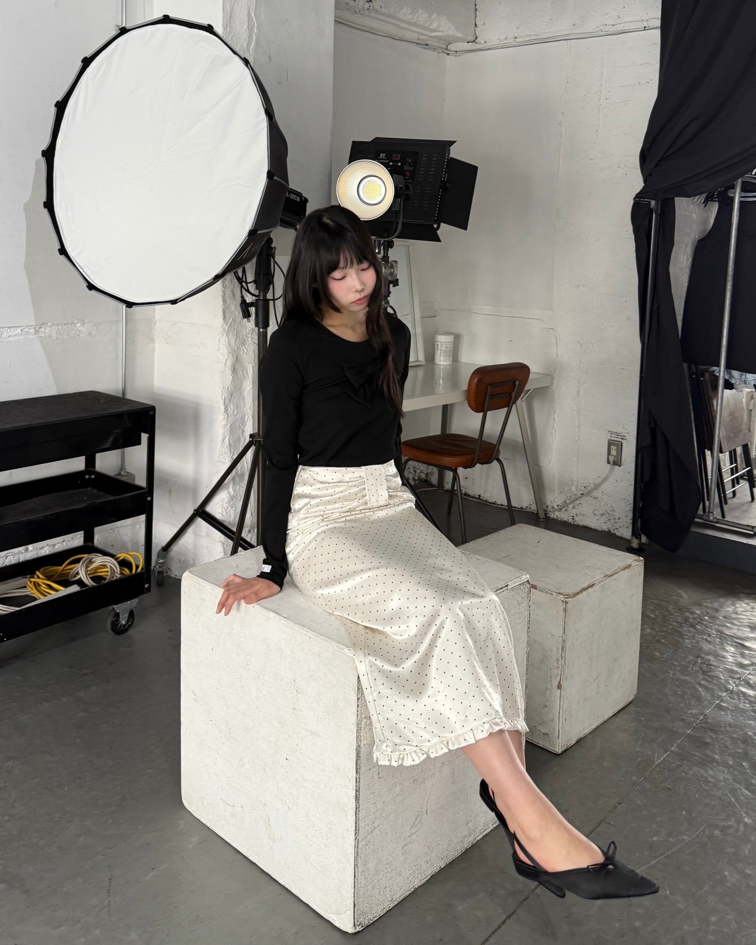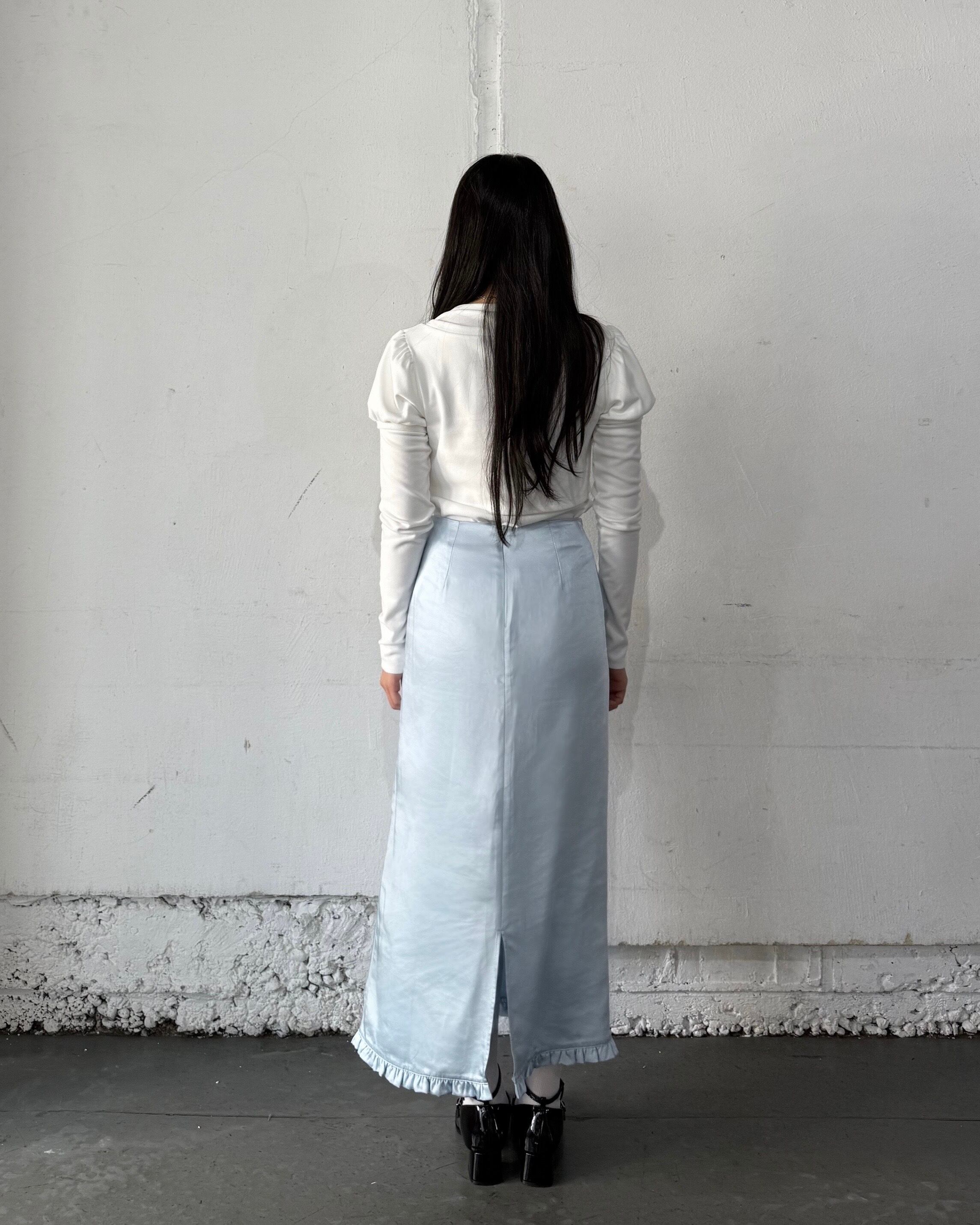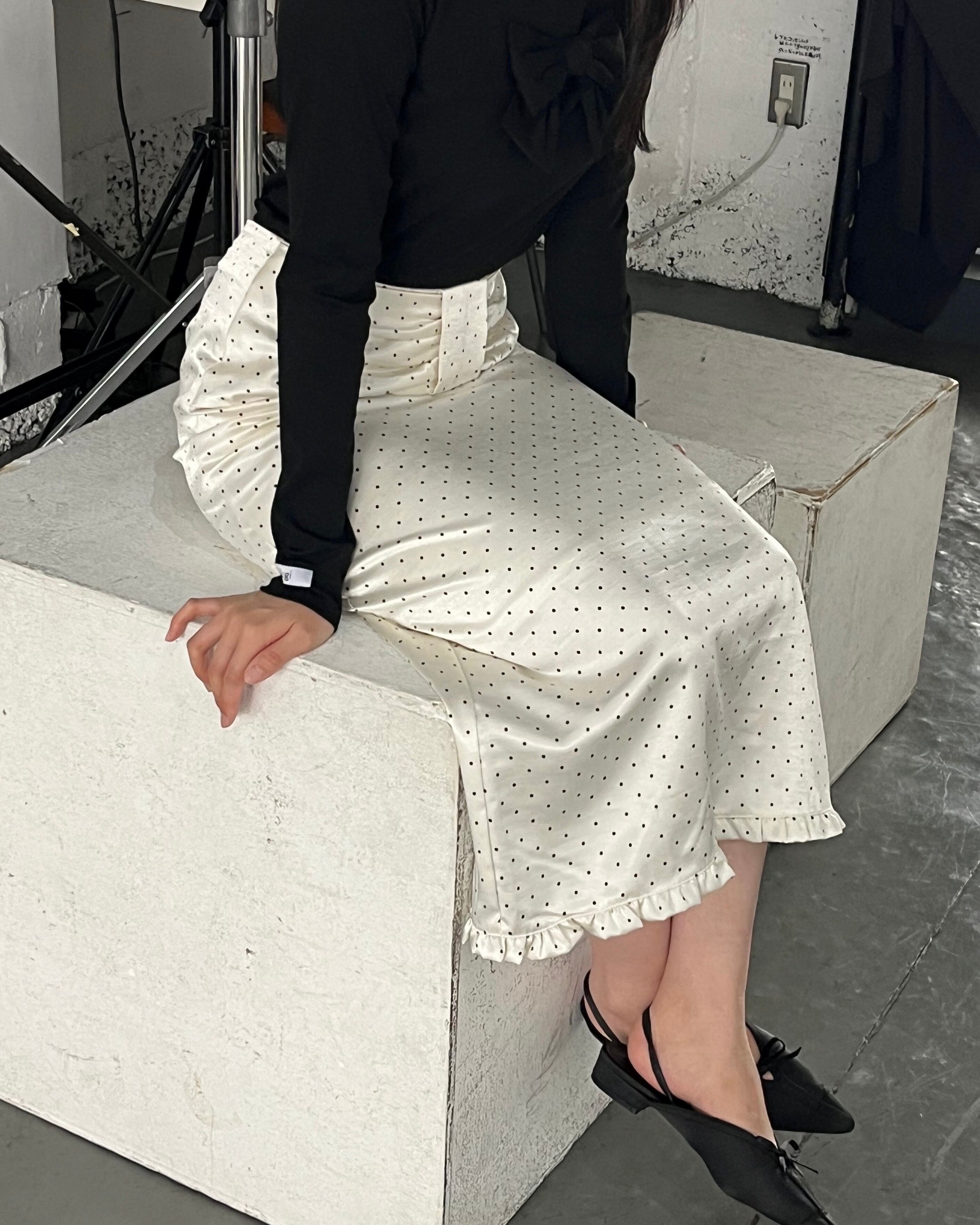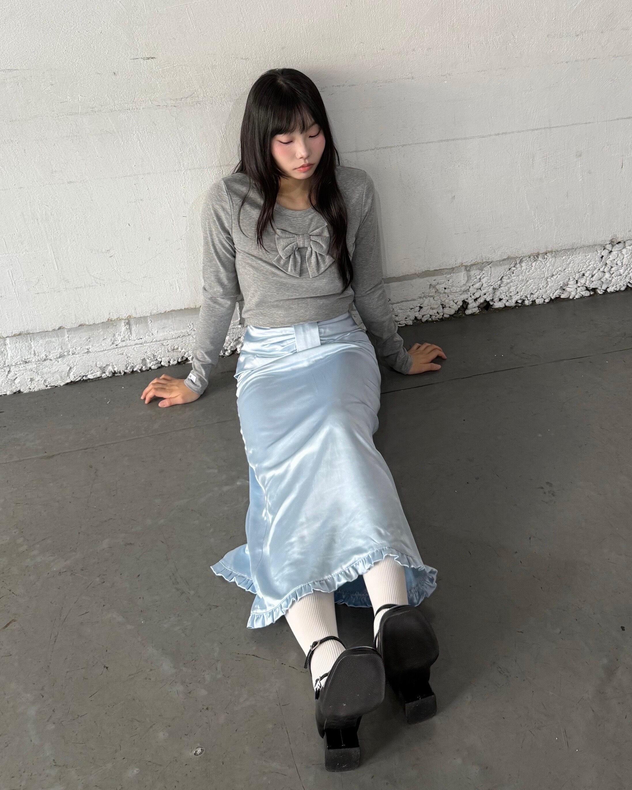サテン生地を使用した軽やかで上品な雰囲気のロングスカート。