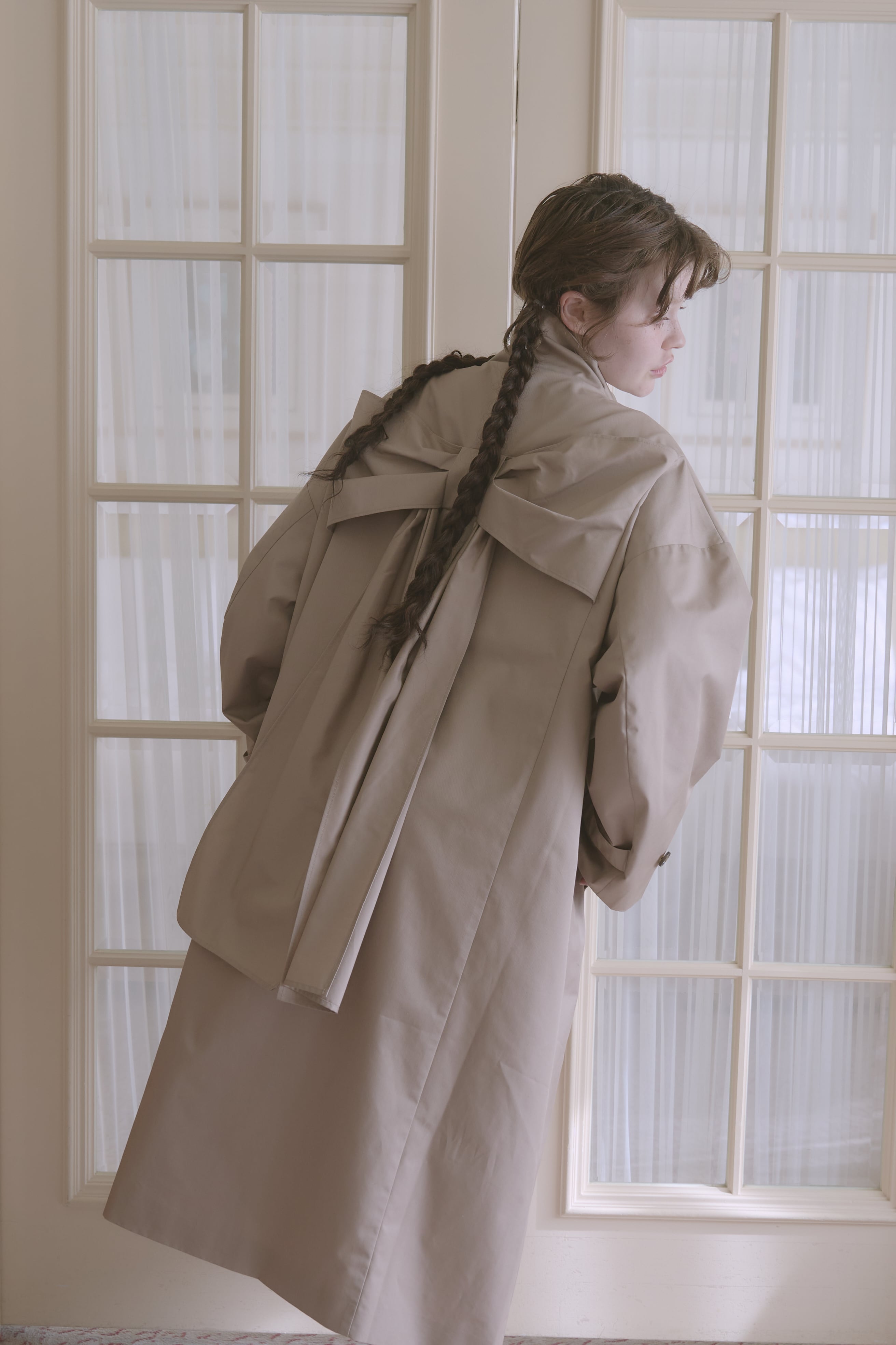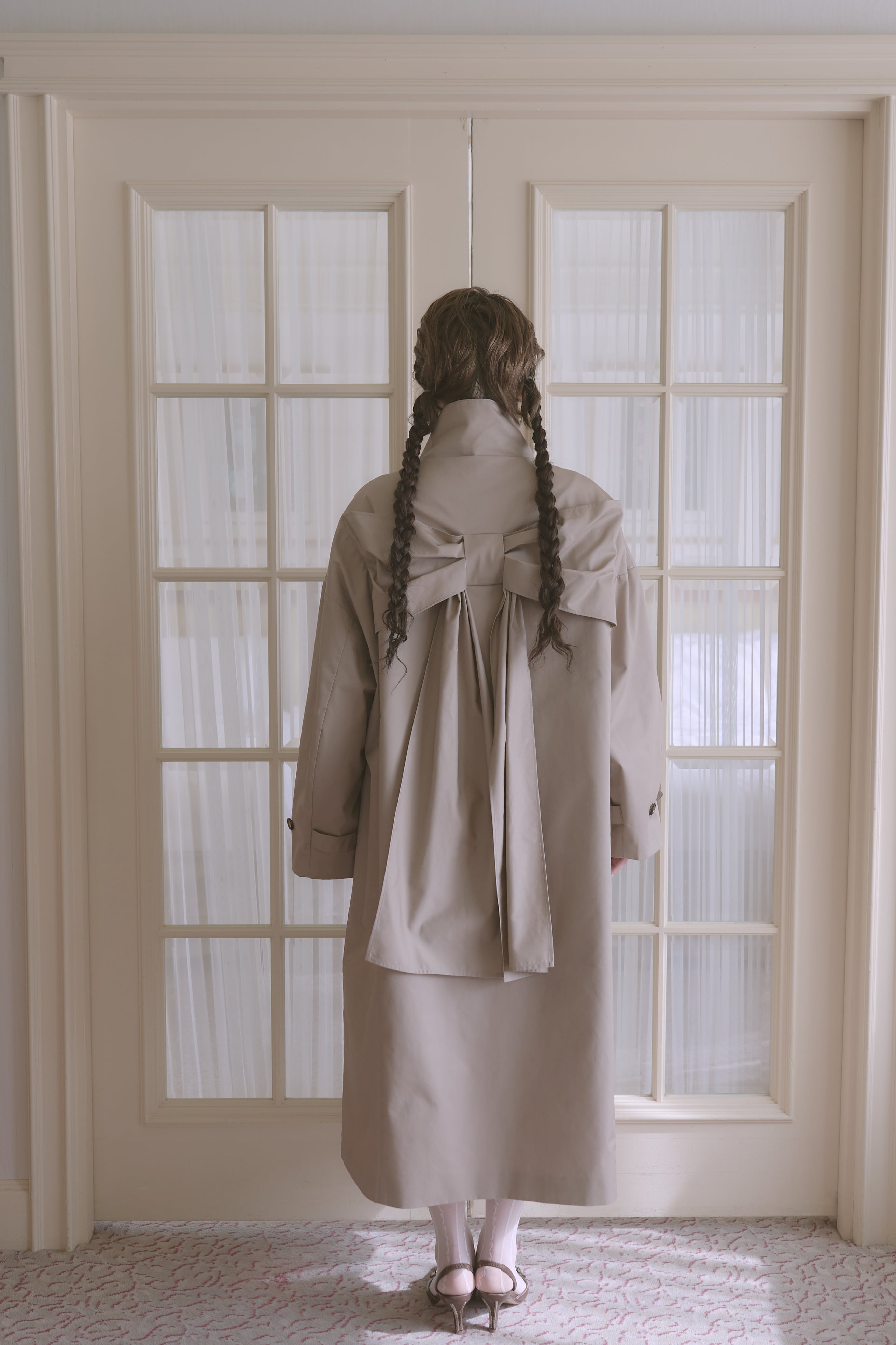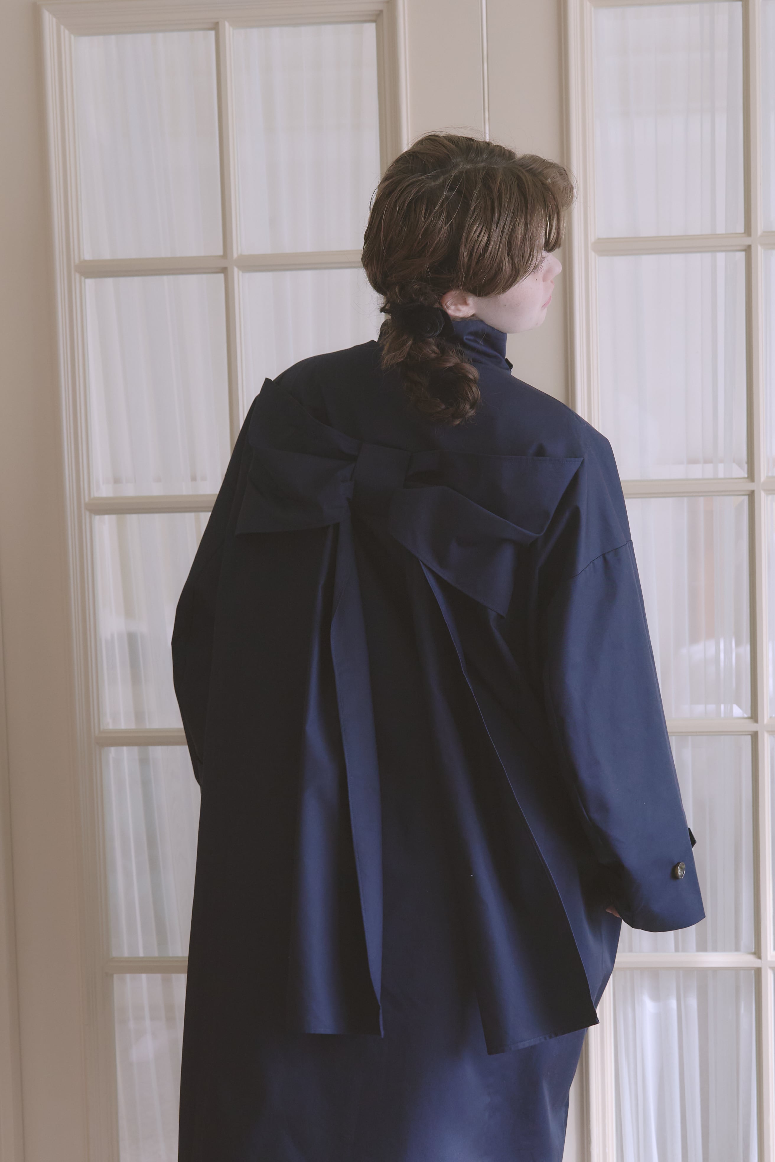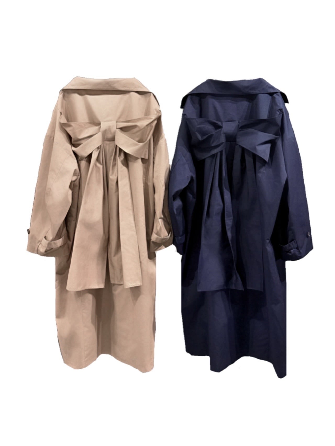 バックスタイルに大きなリボンがあしらわれた唯一無二のトレンチコート。