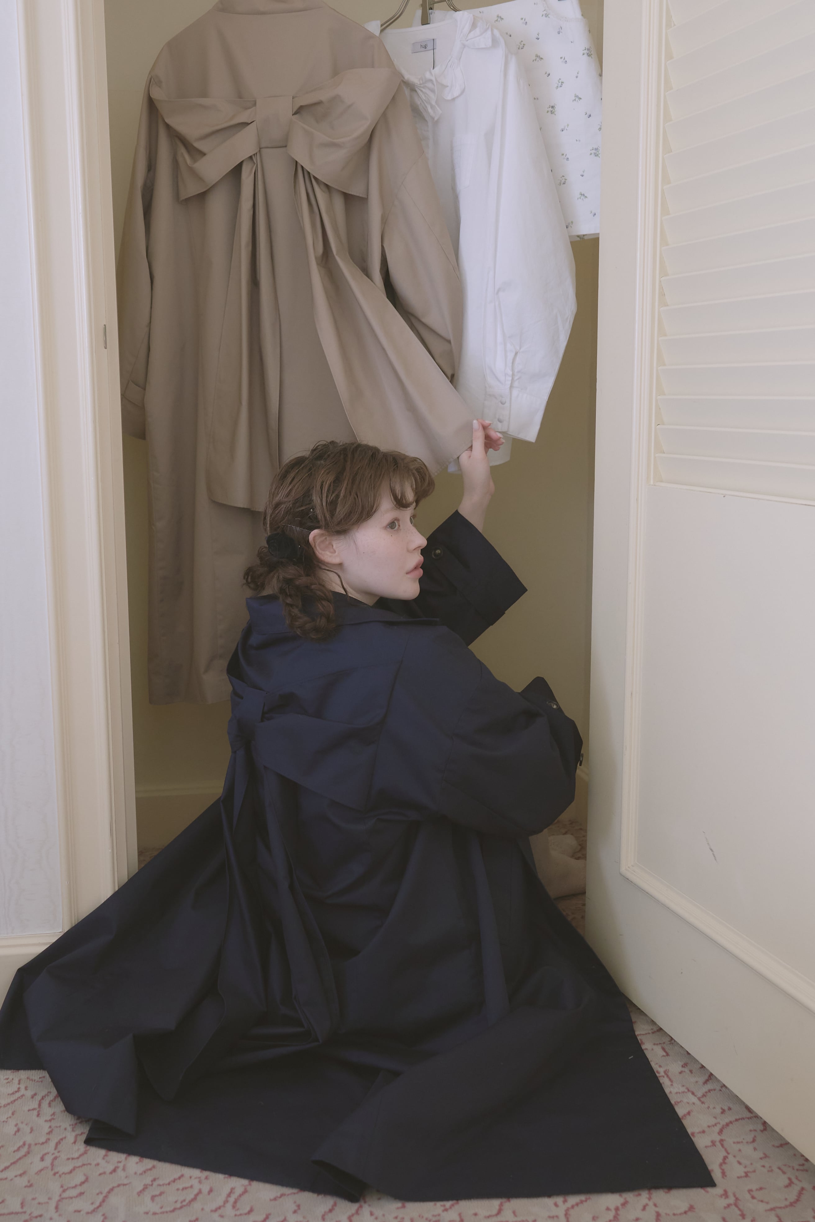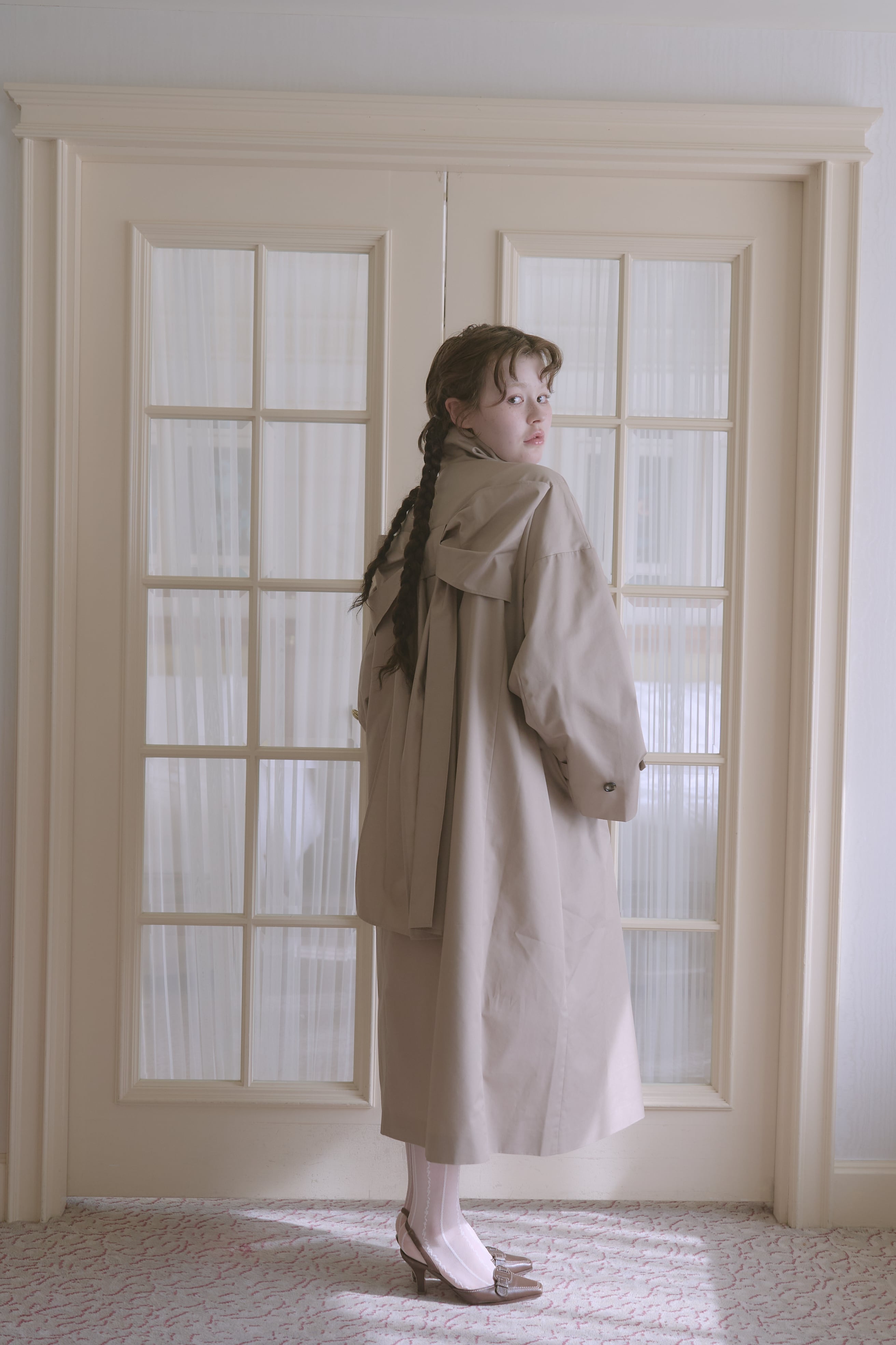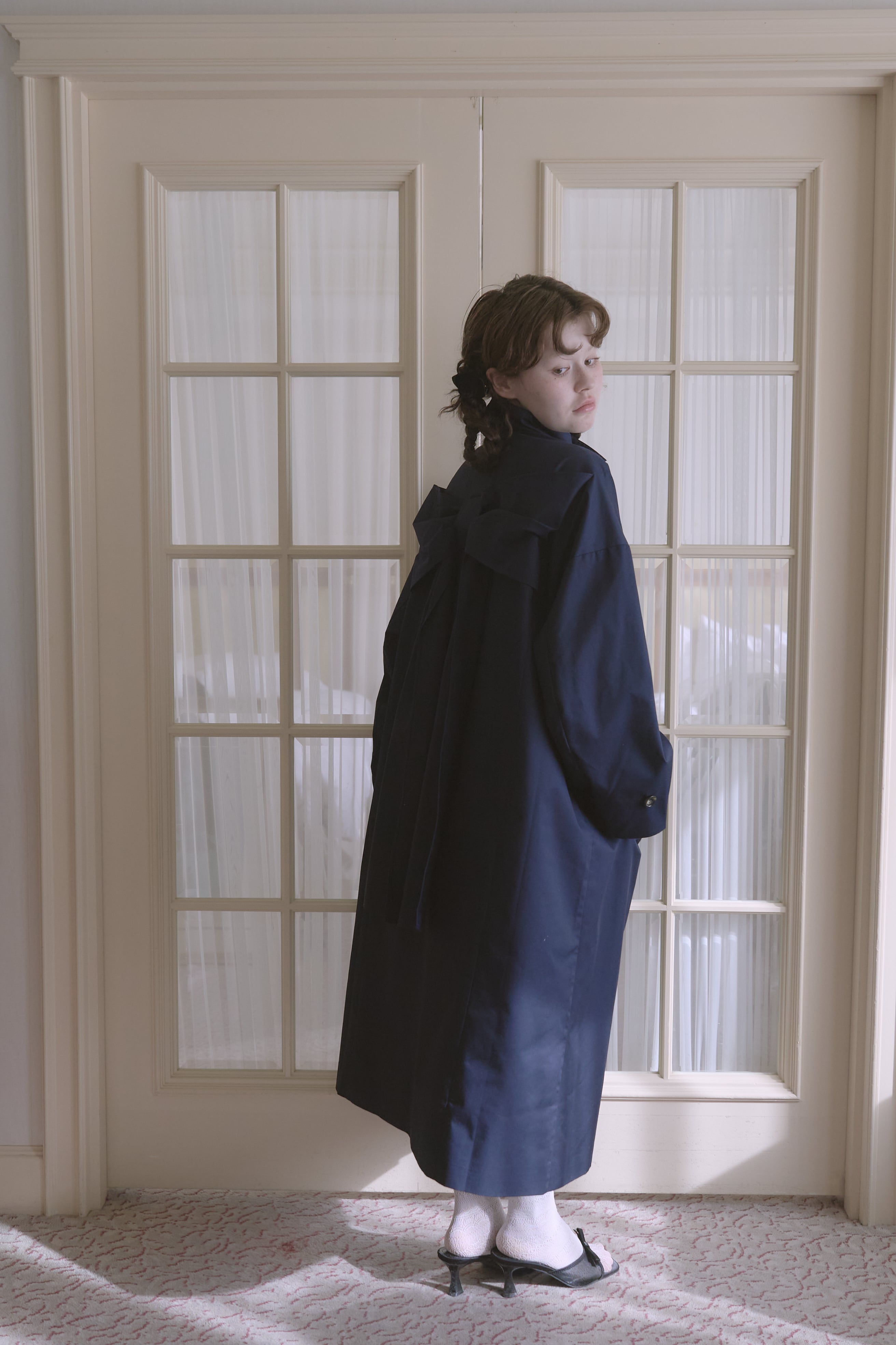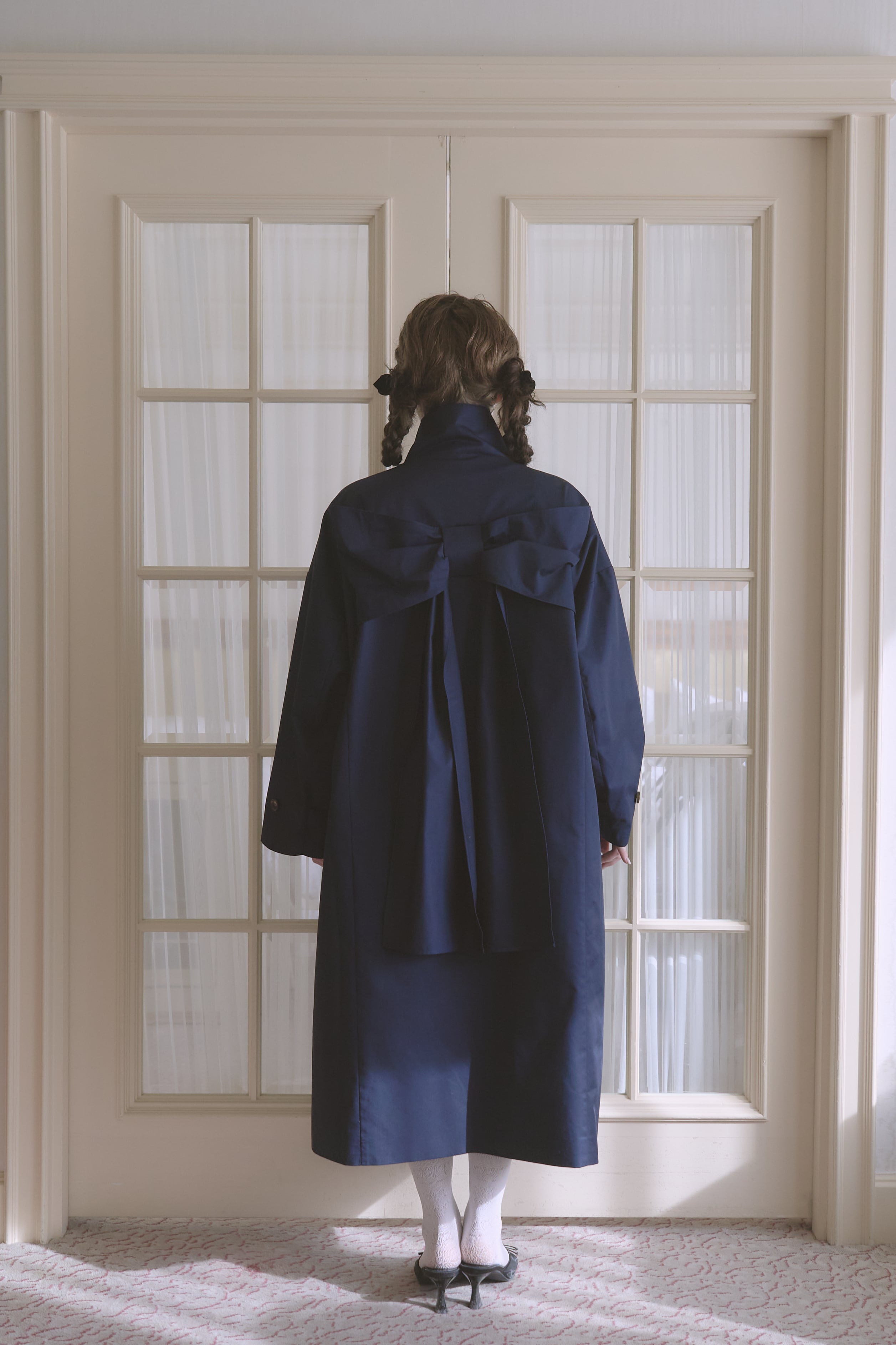 バックスタイルに大きなリボンがあしらわれた唯一無二のトレンチコート。
