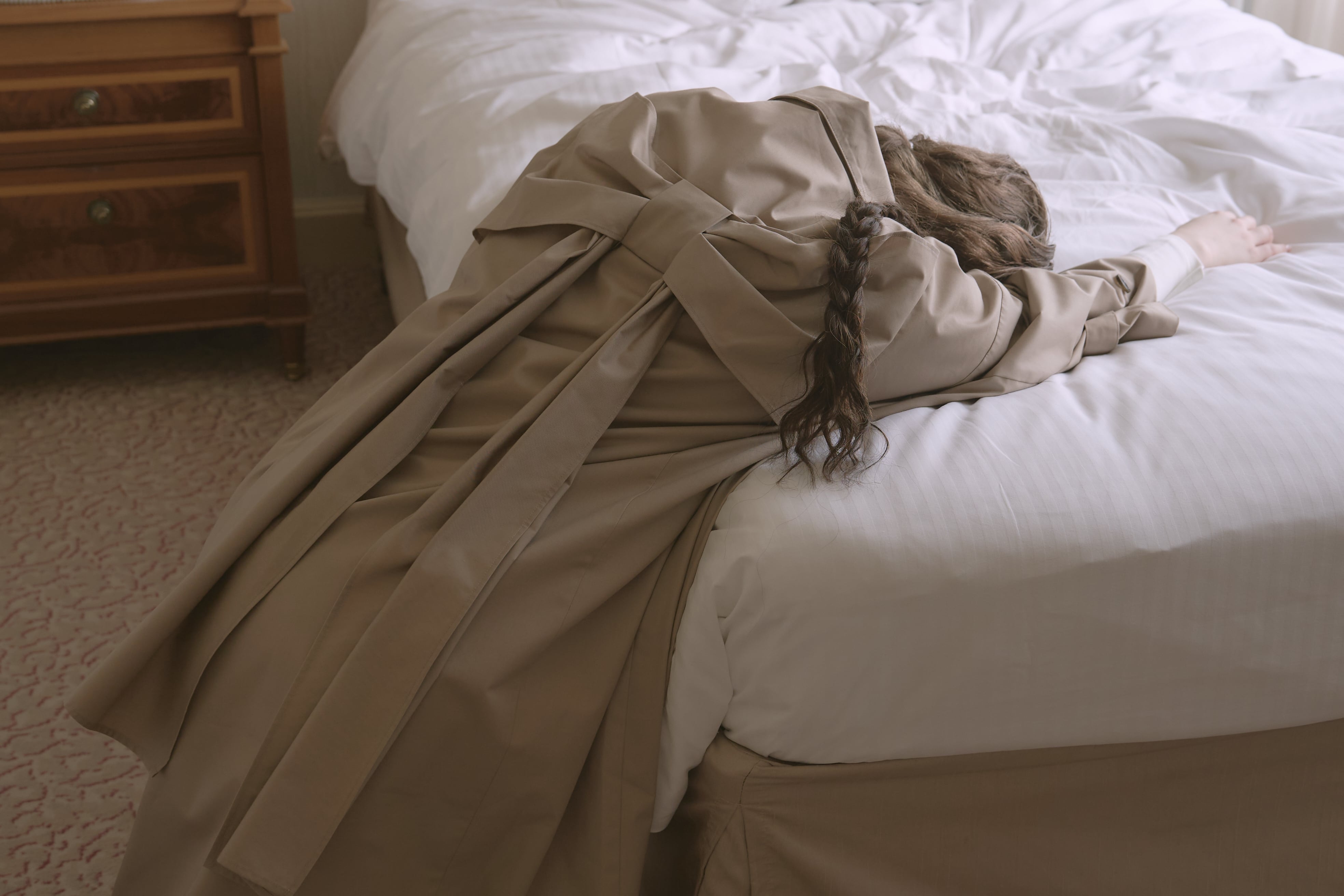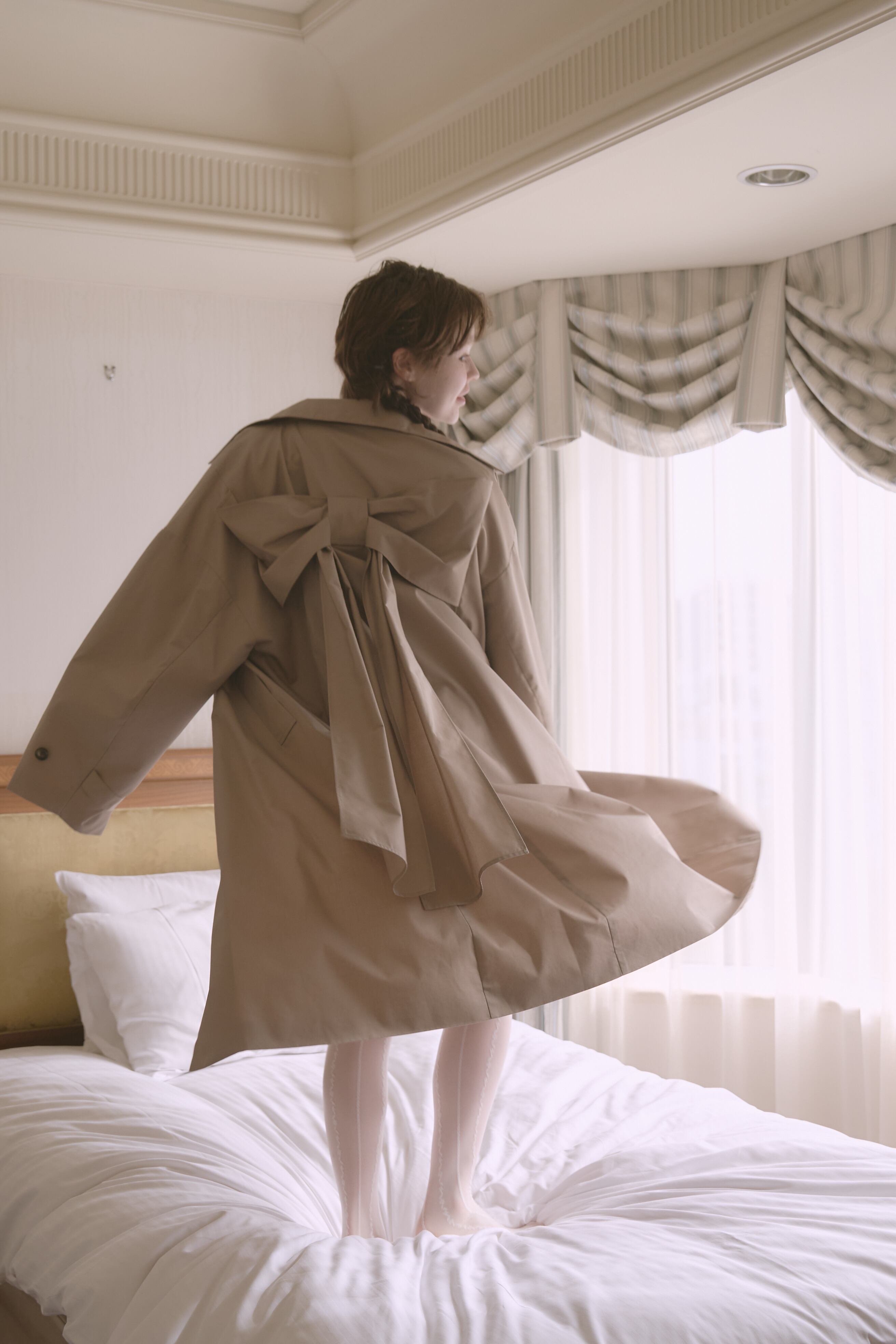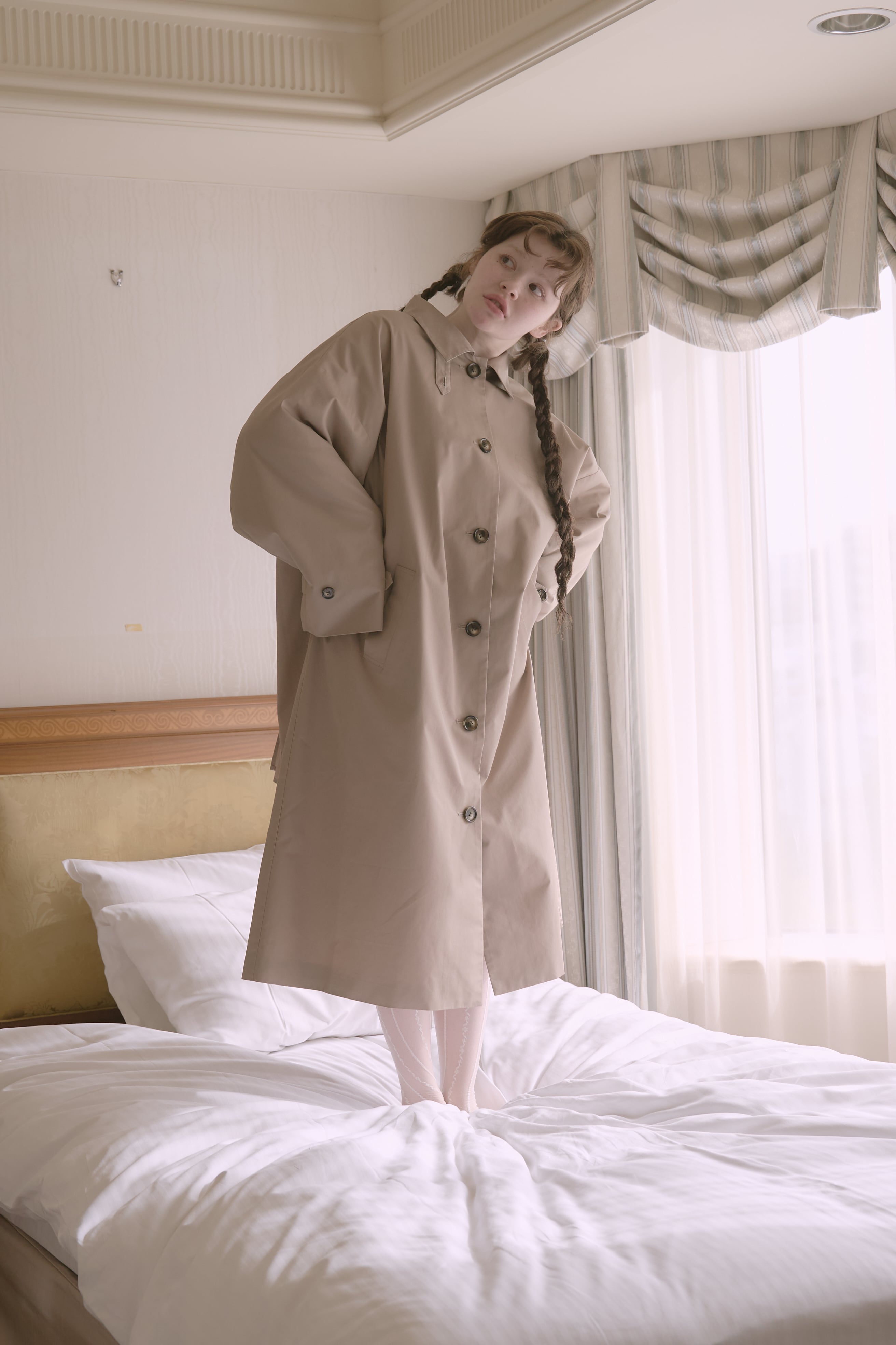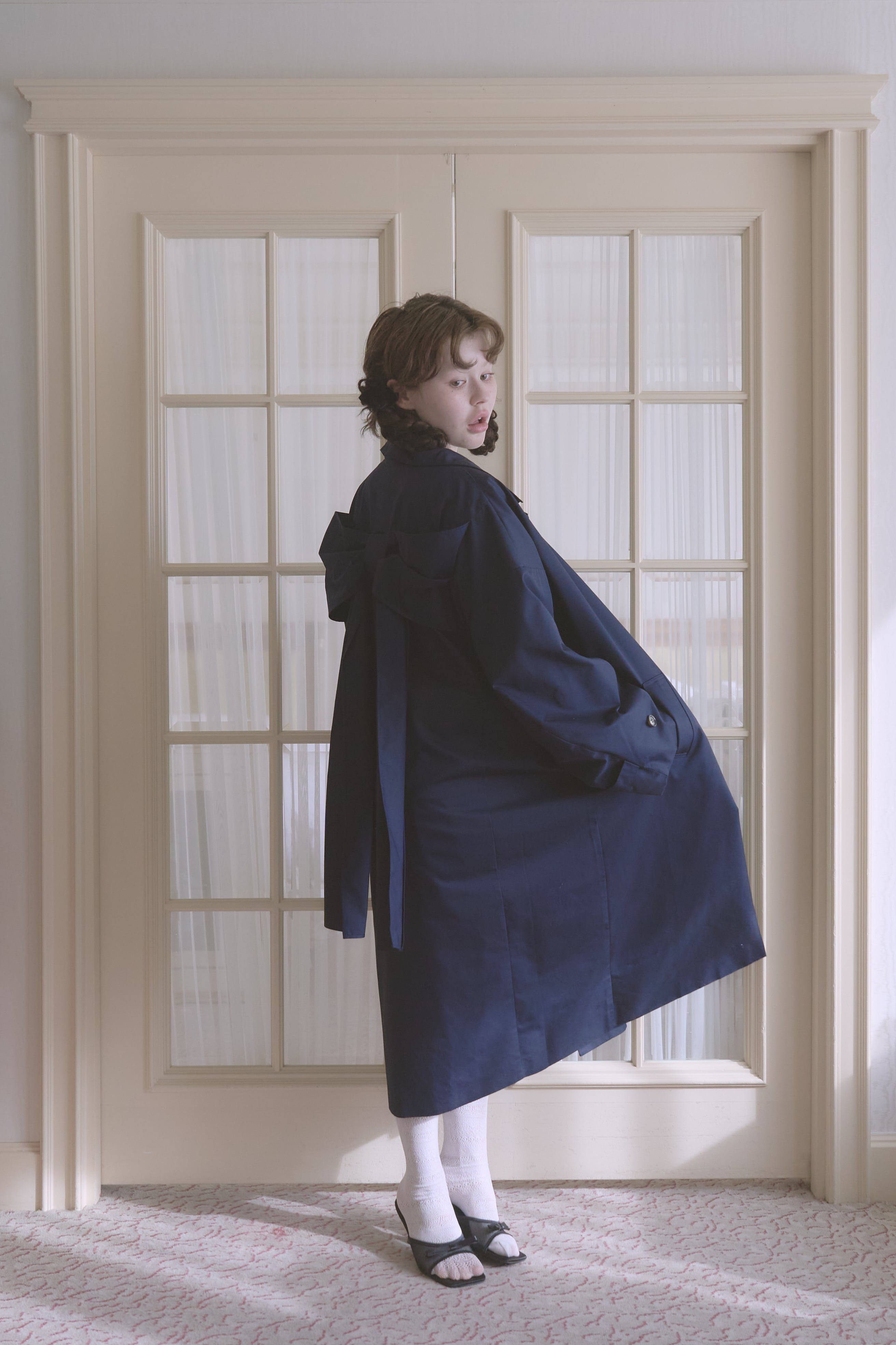 バックスタイルに大きなリボンがあしらわれた唯一無二のトレンチコート。