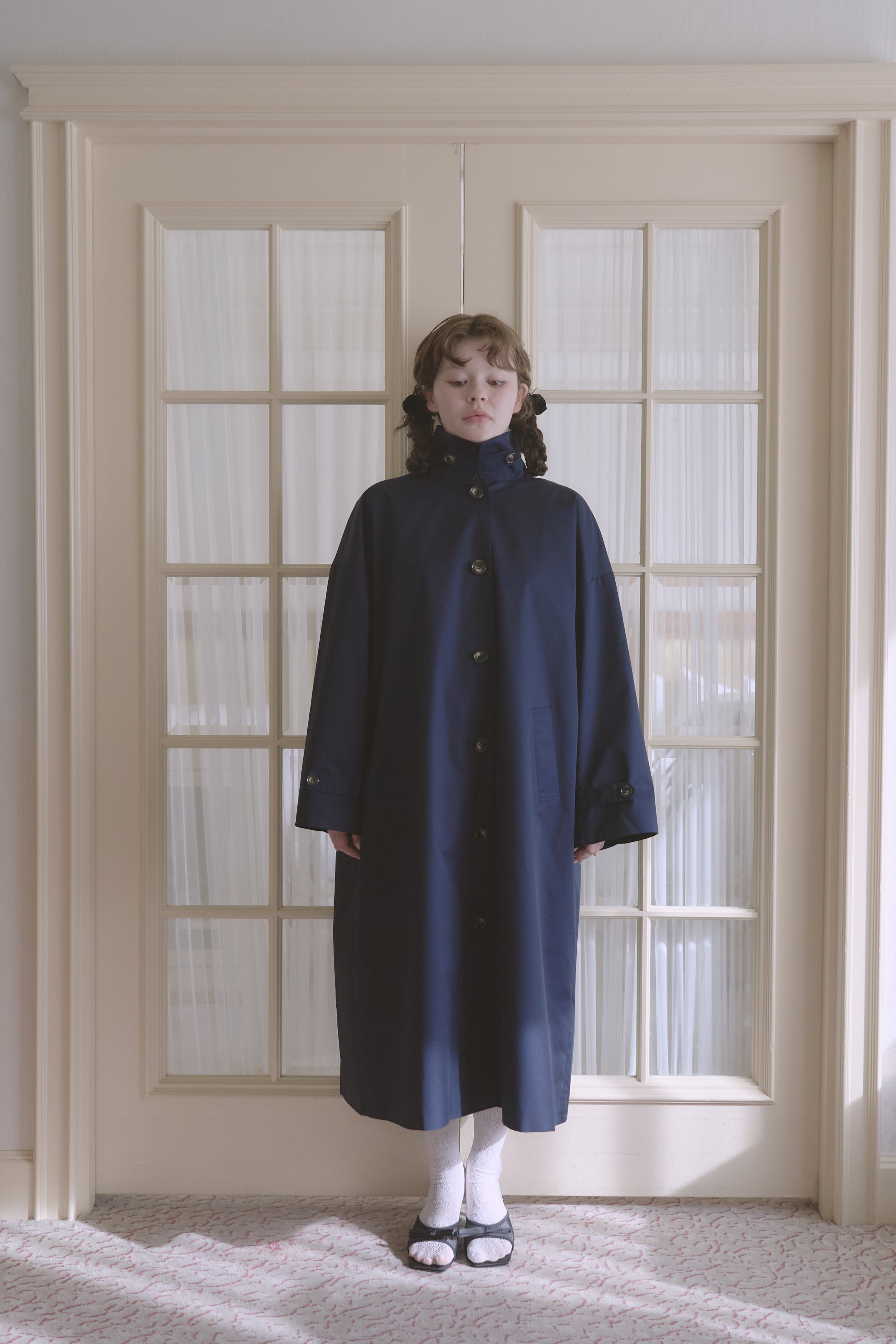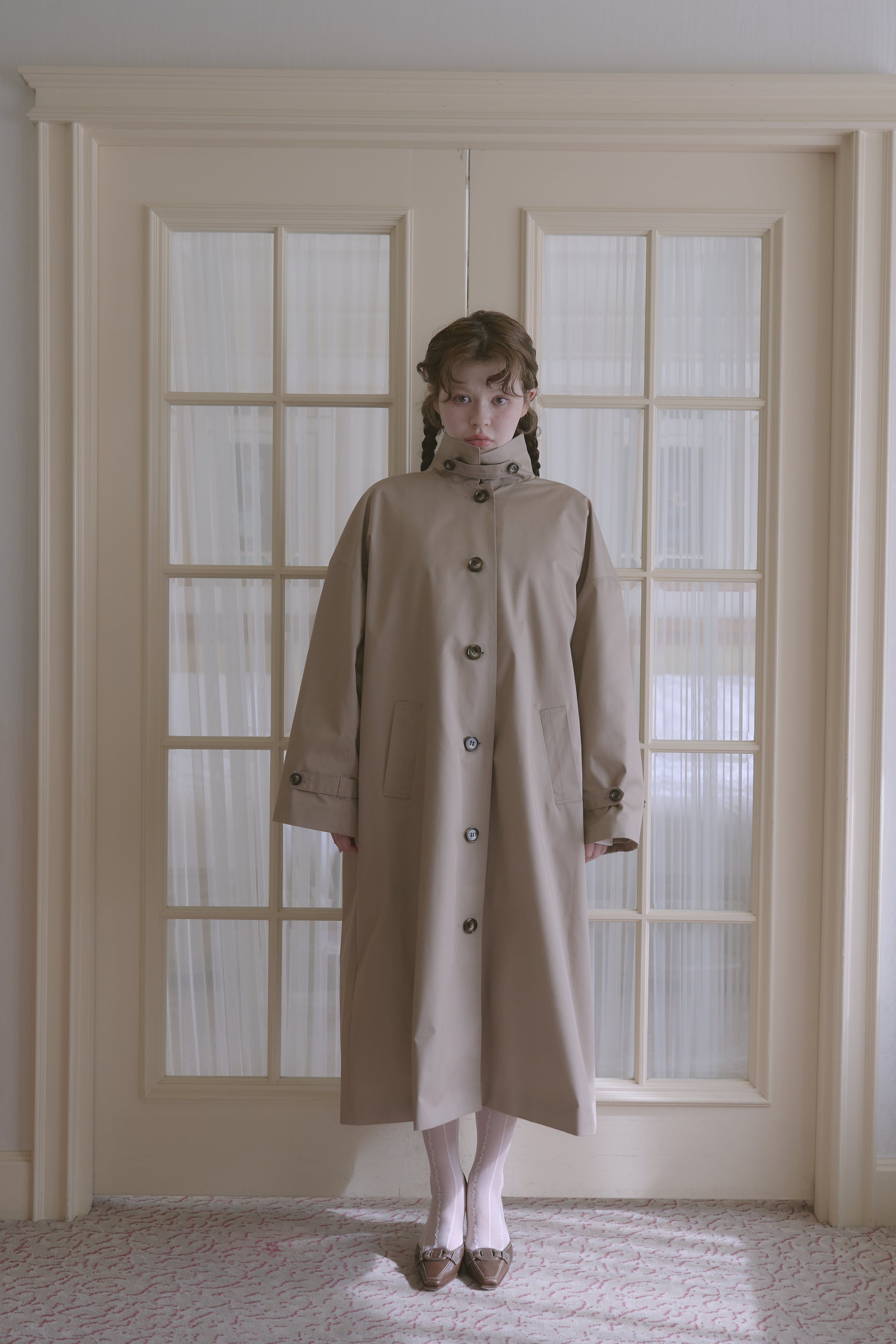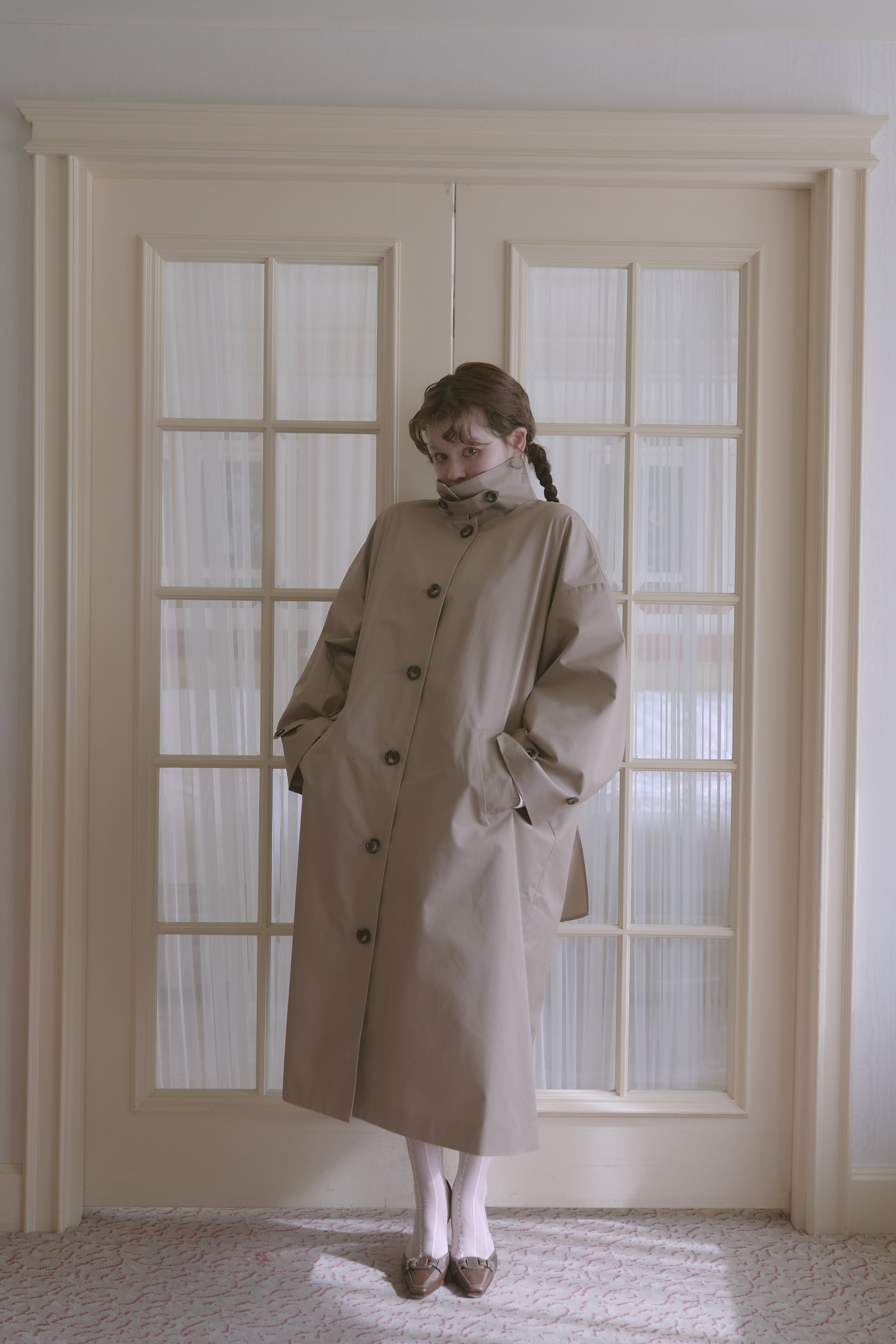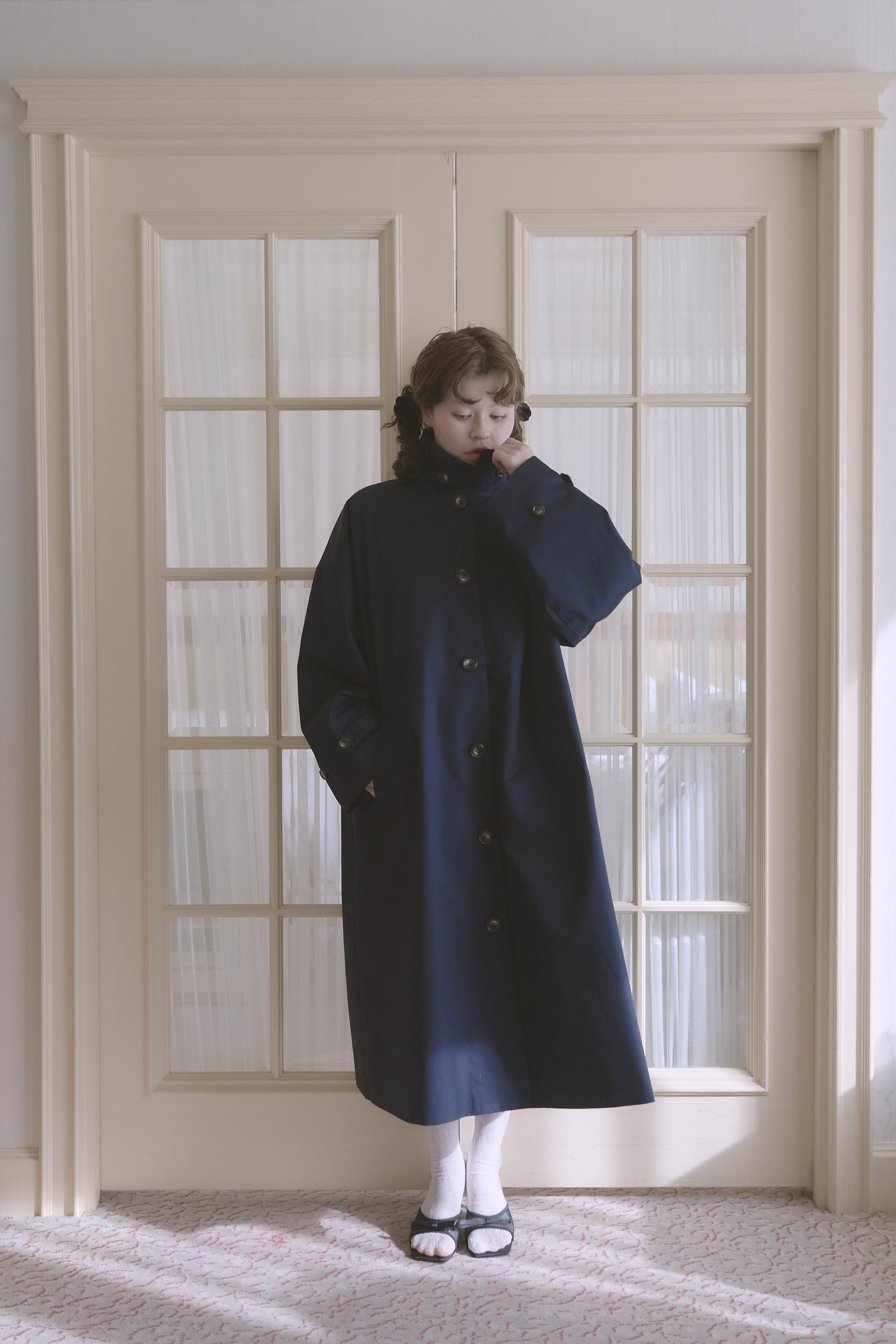 絶妙な丈感と、高めのスタンドカラーで少しレディなムードを演出。