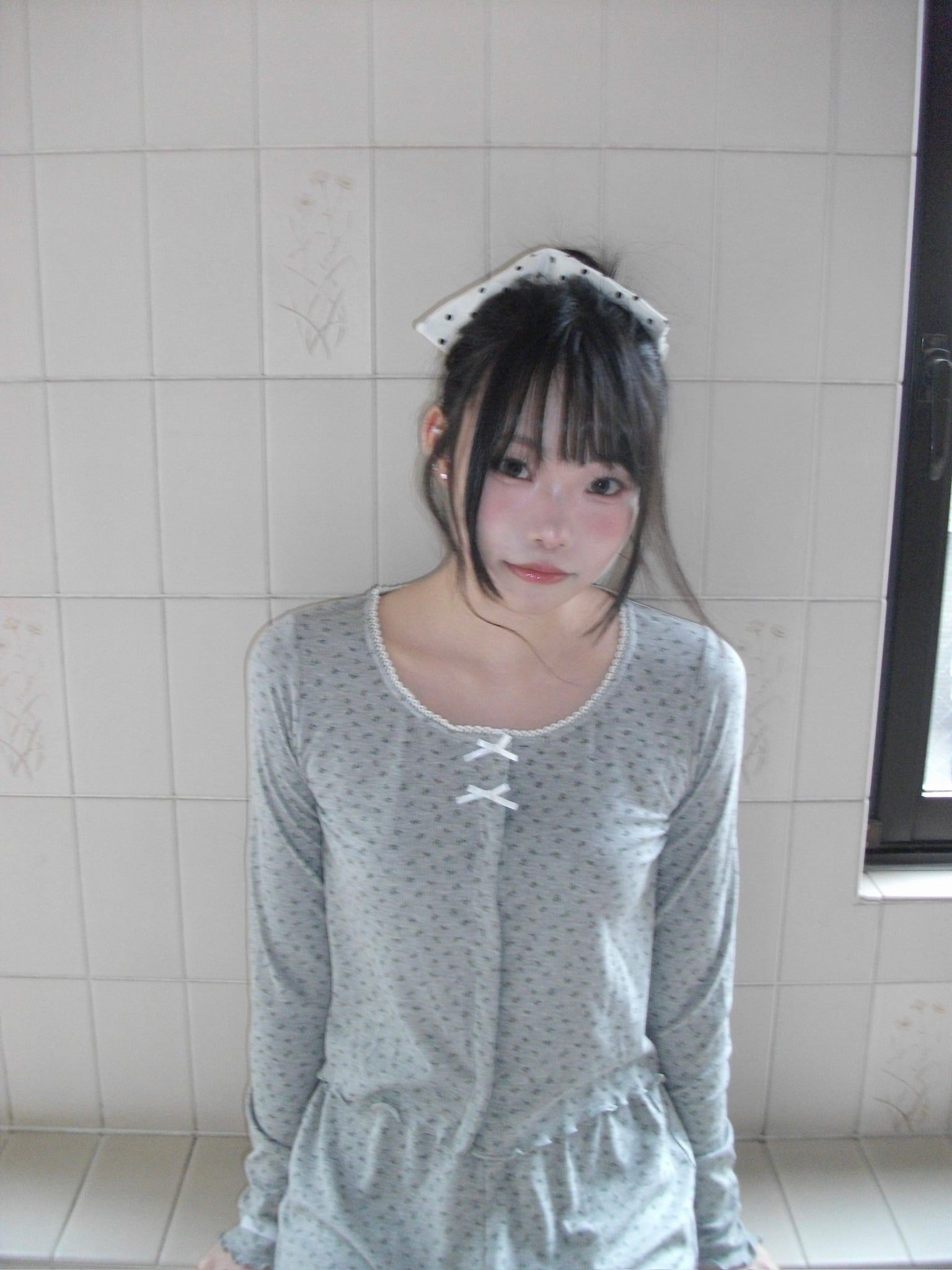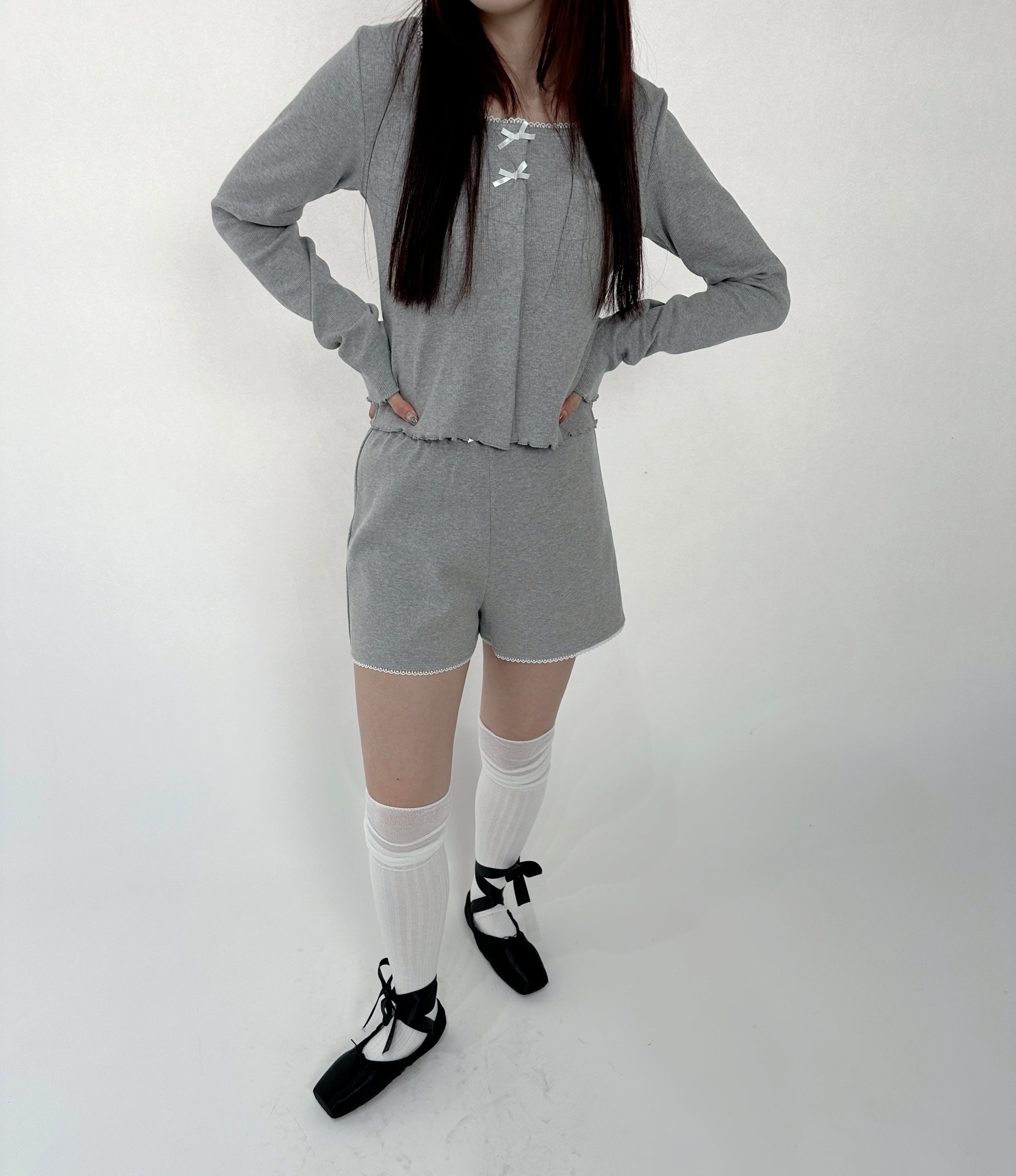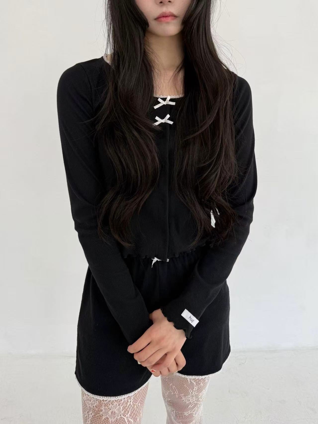 小さいリボンとピコレースがポイントのリブ素材のセットアップです。