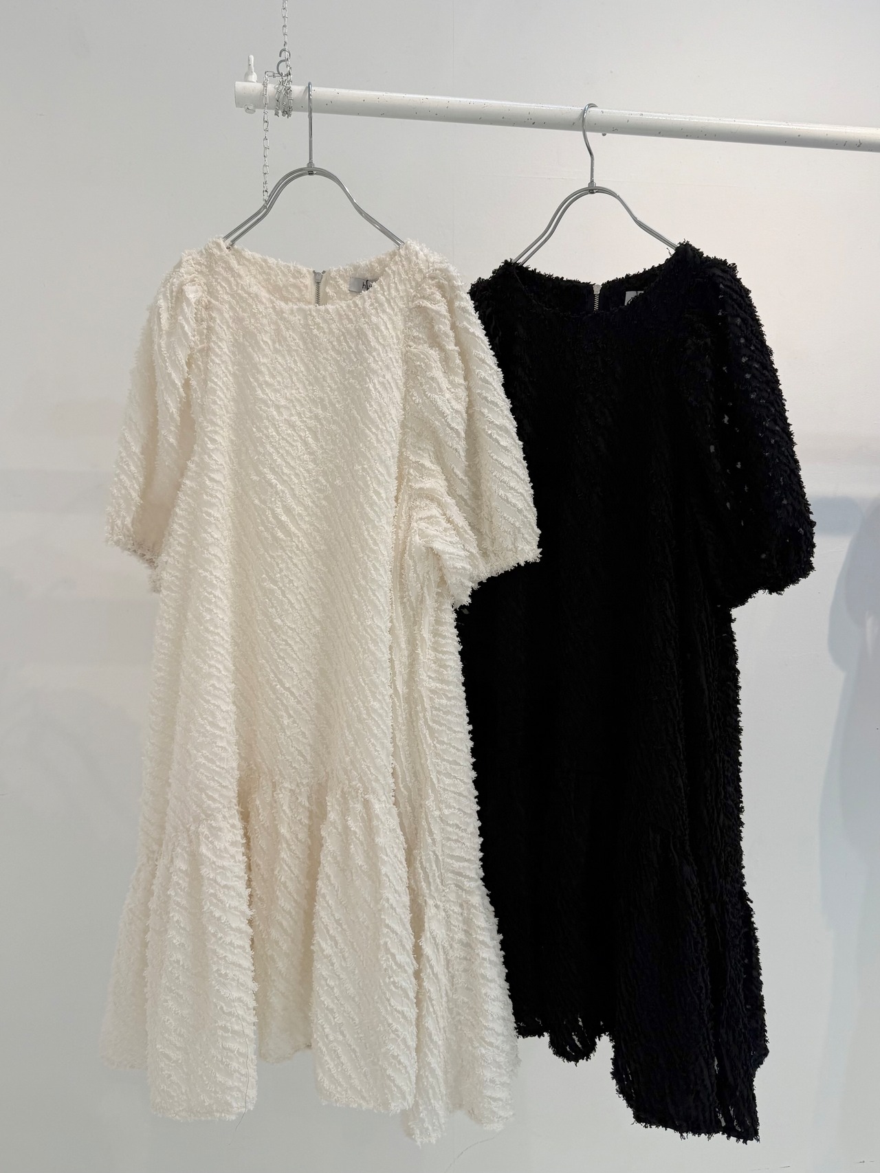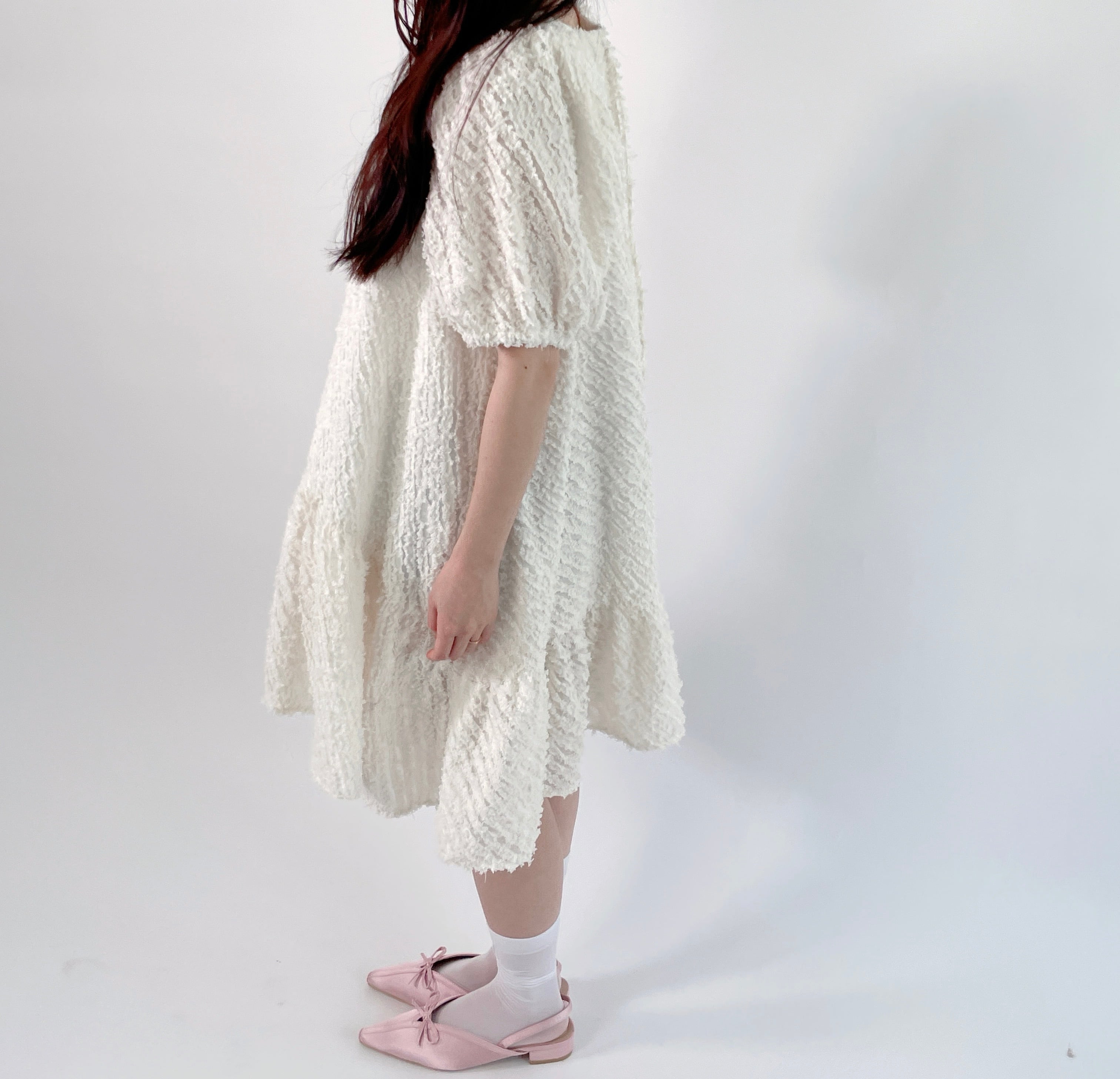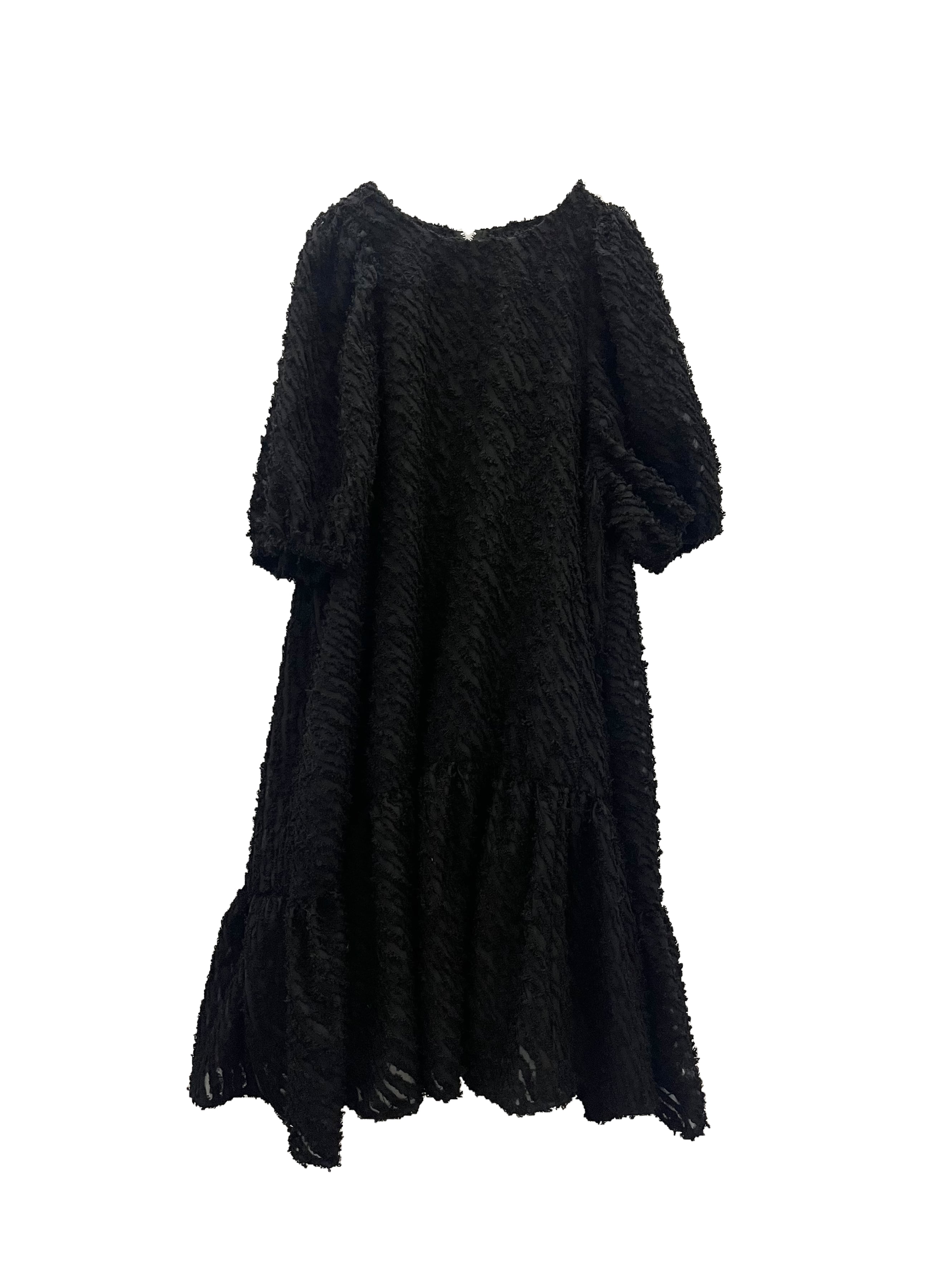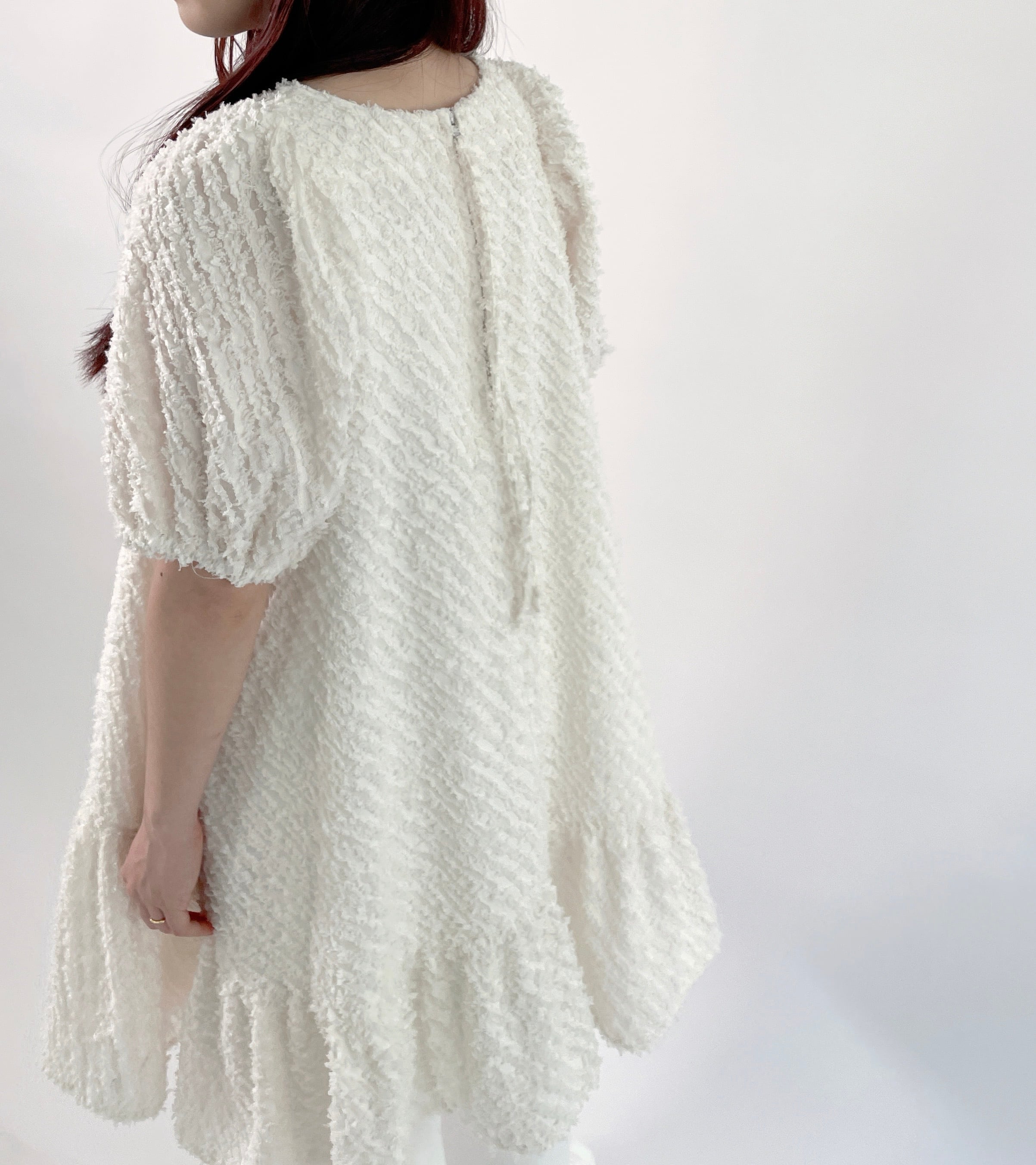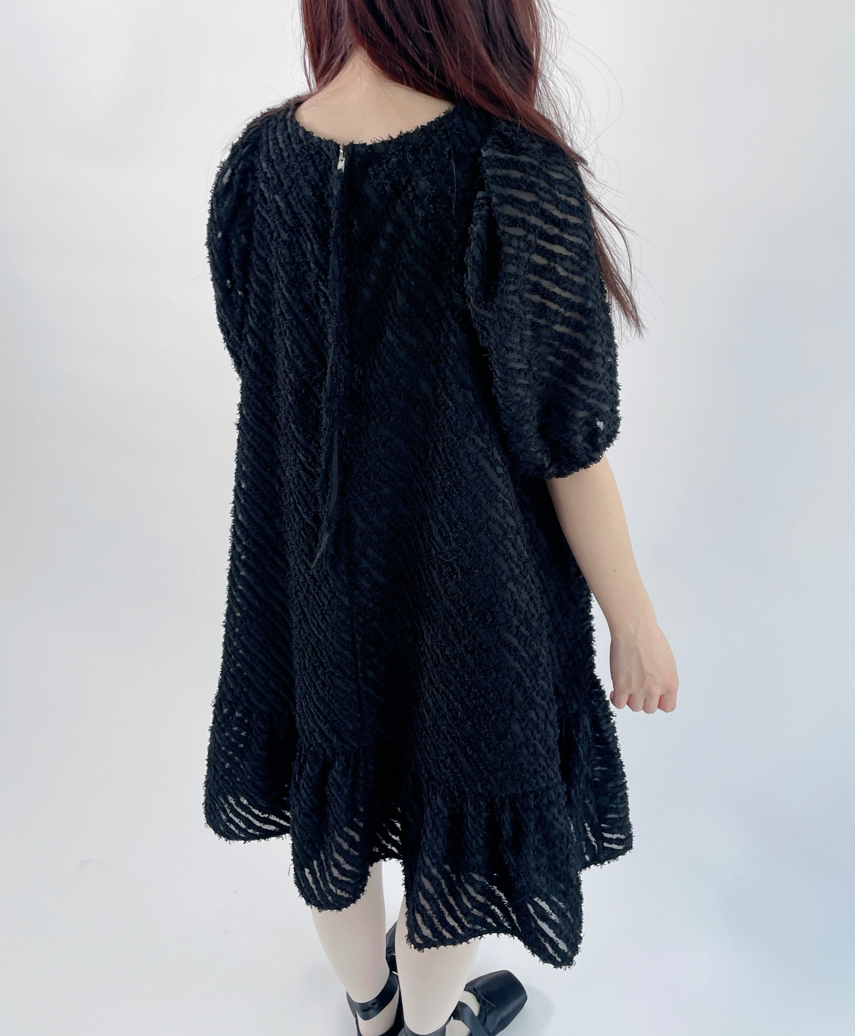 透け感のあるフリンジ素材を使用したラウンドヘムのティアードワンピースです。