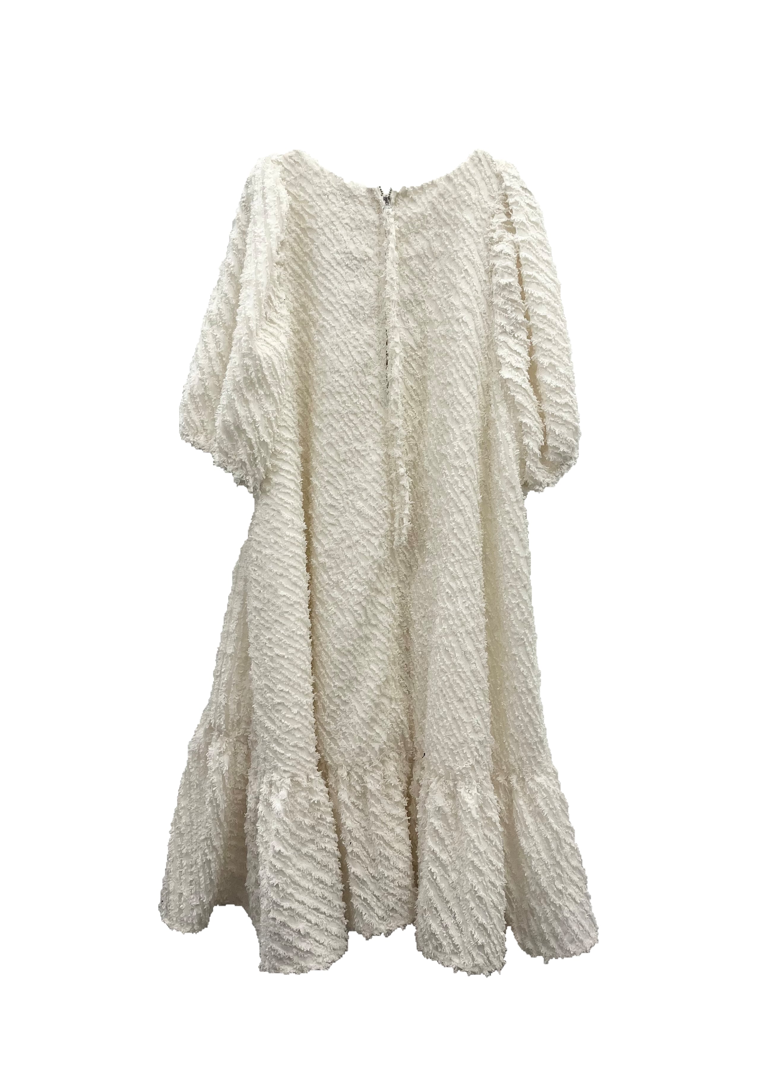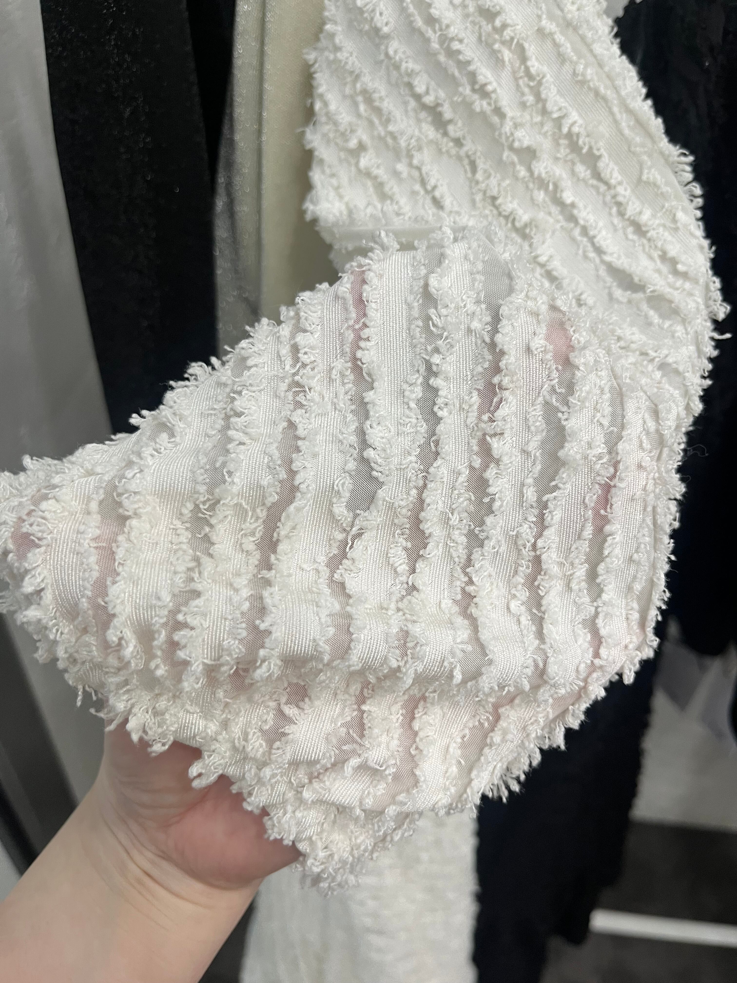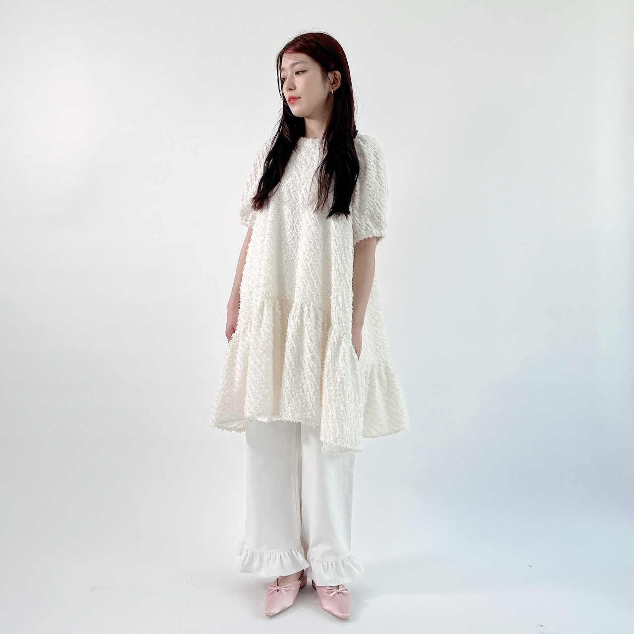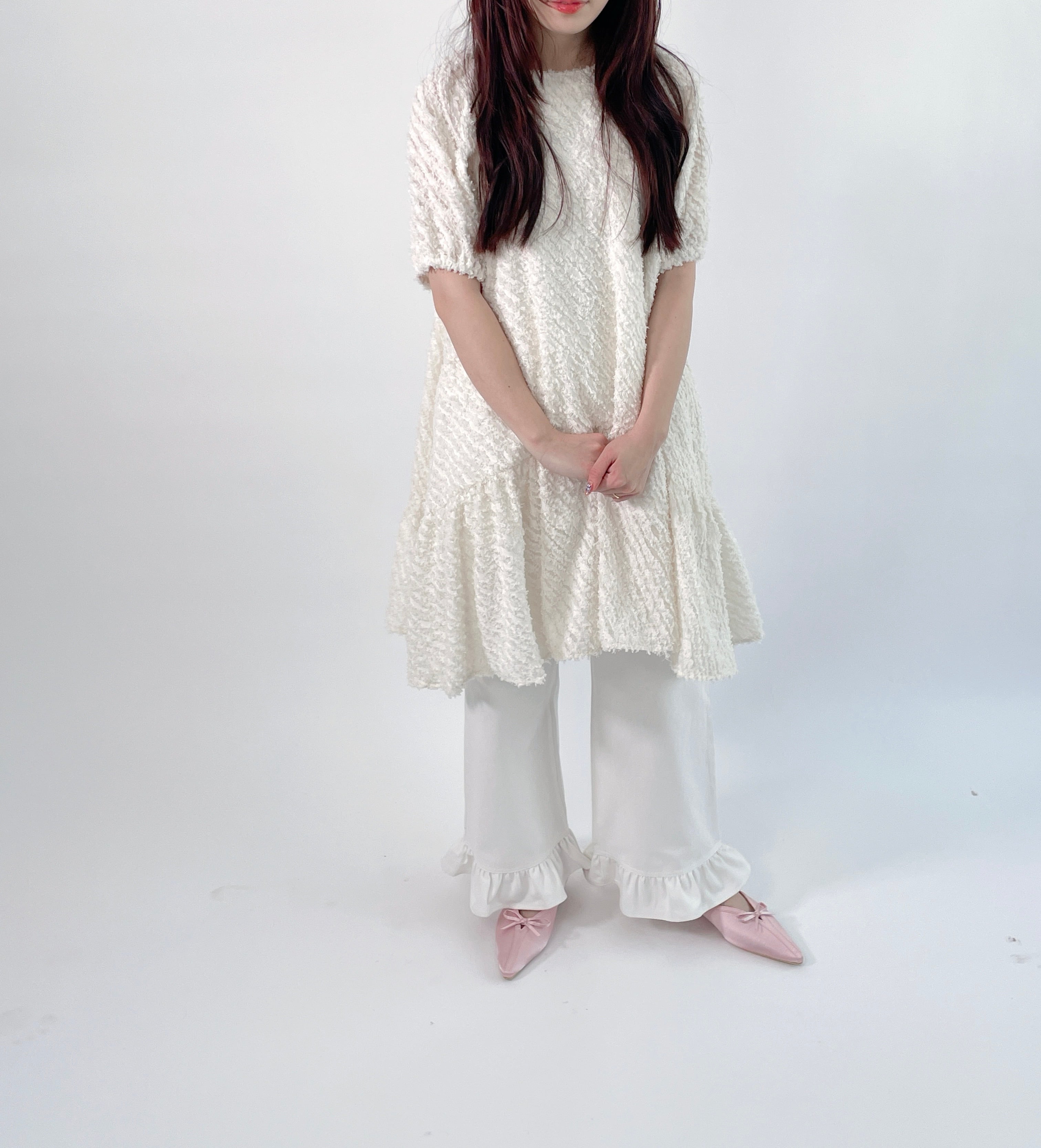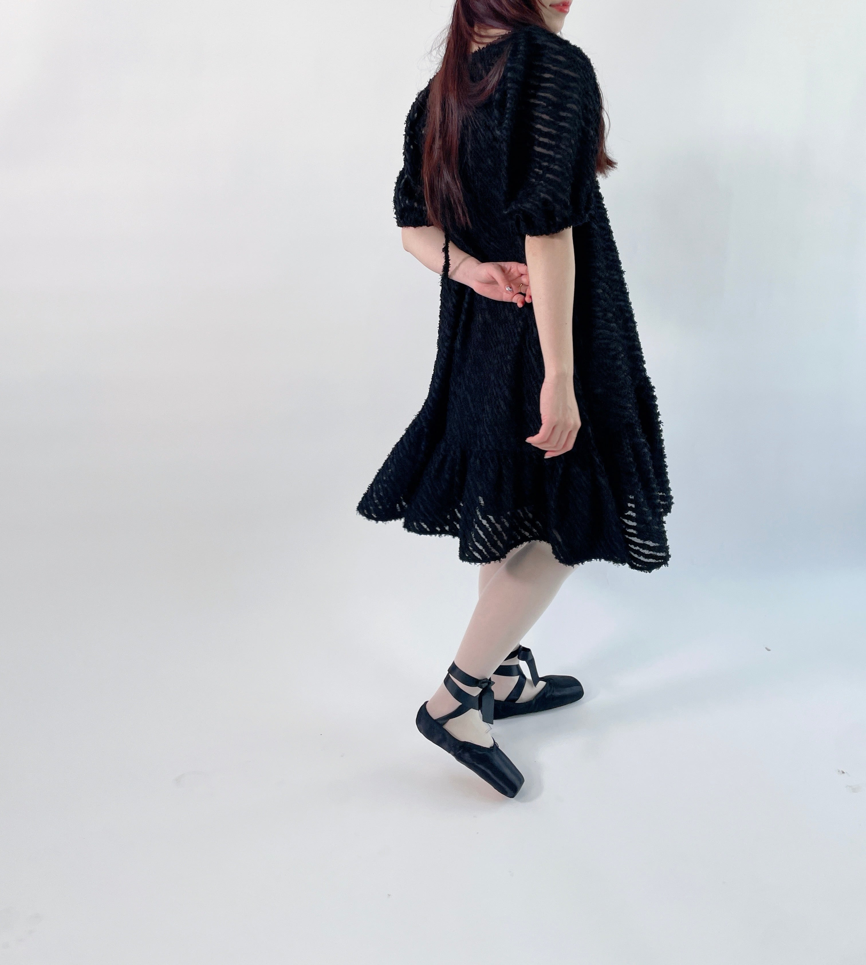 透け感のあるフリンジ素材を使用したラウンドヘムのティアードワンピースです。