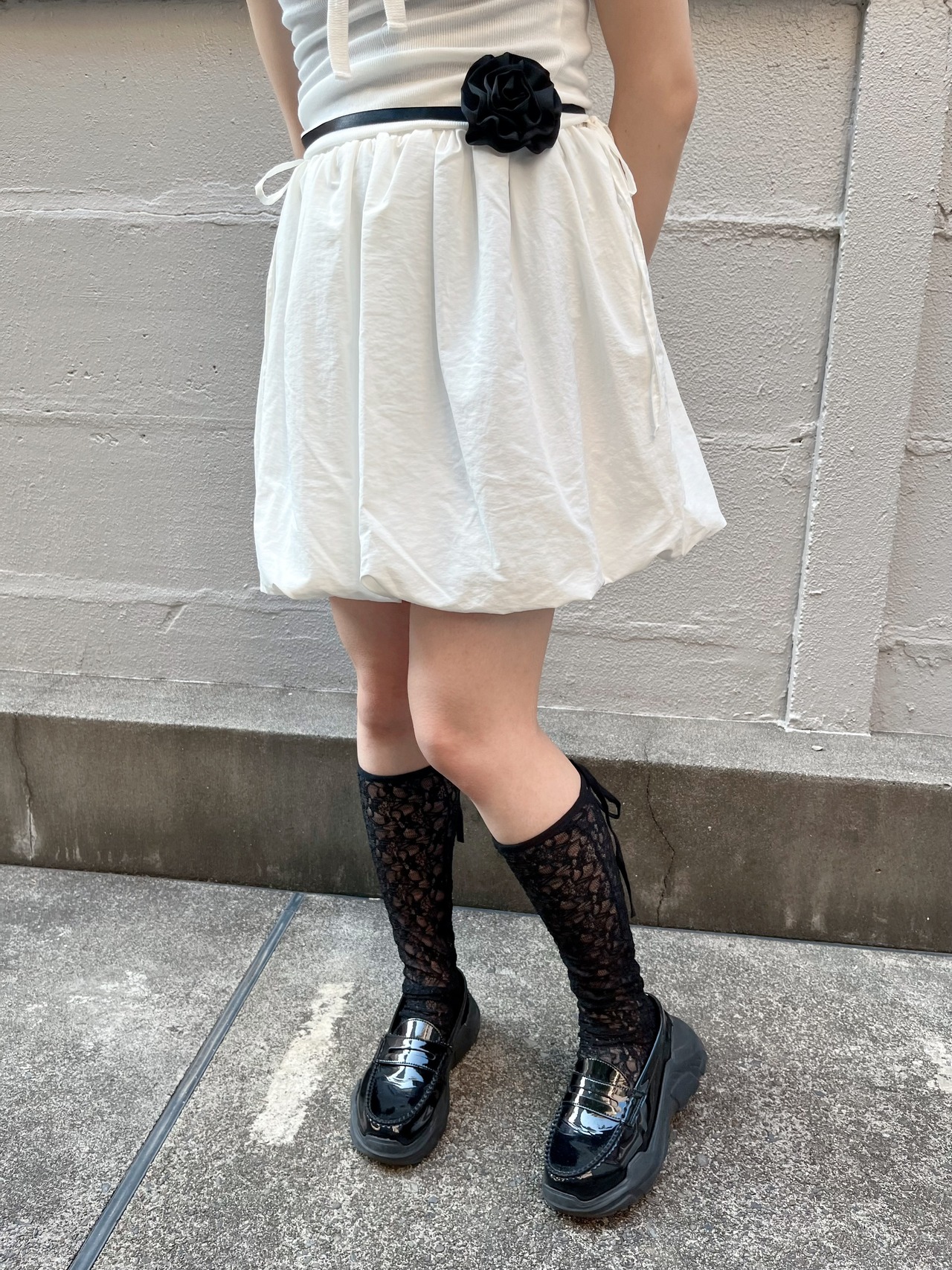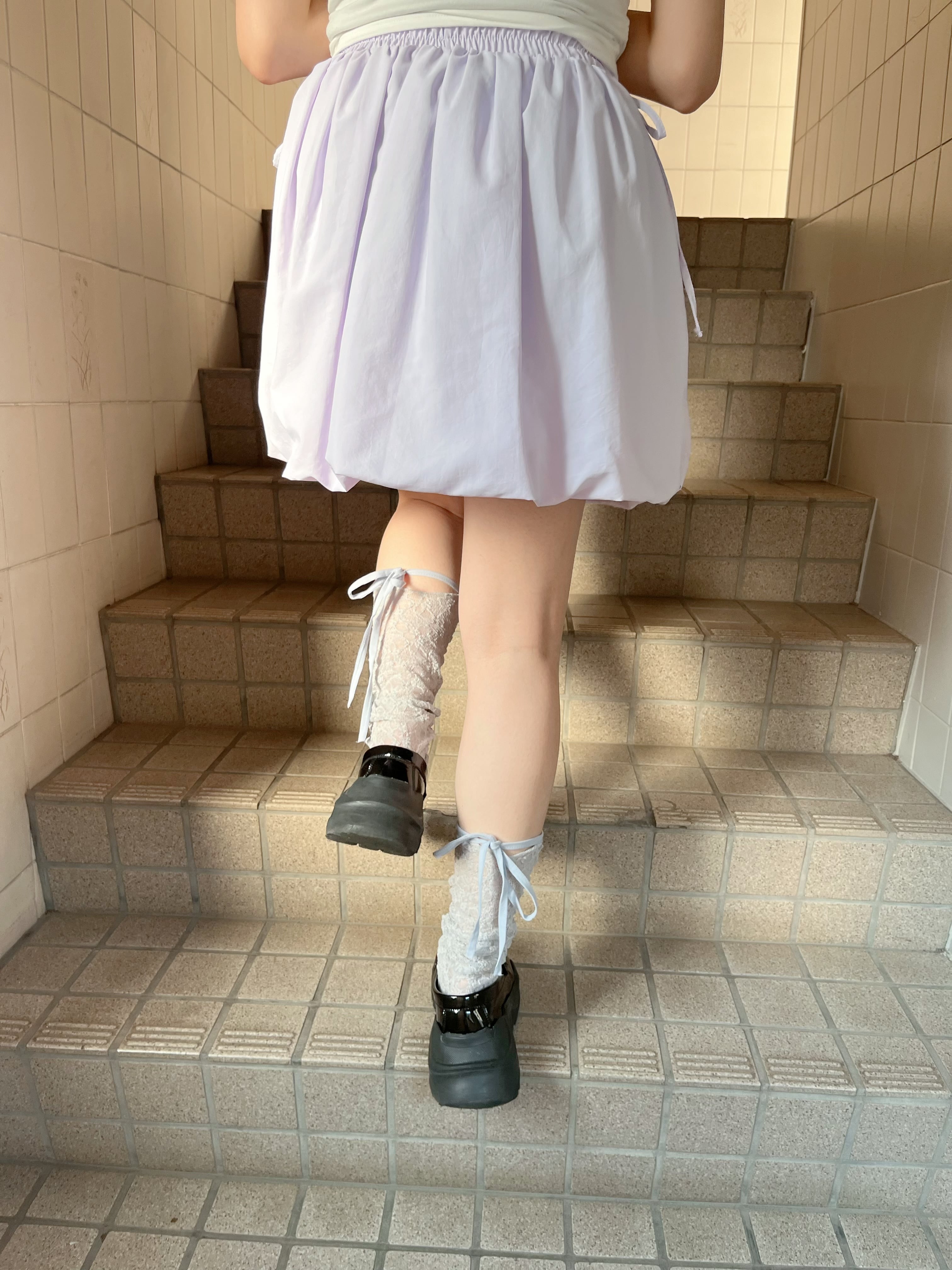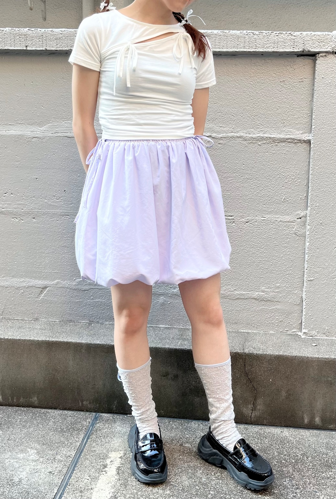 ウエストのサイドのリボンがポイントのパンプキンスカートです。