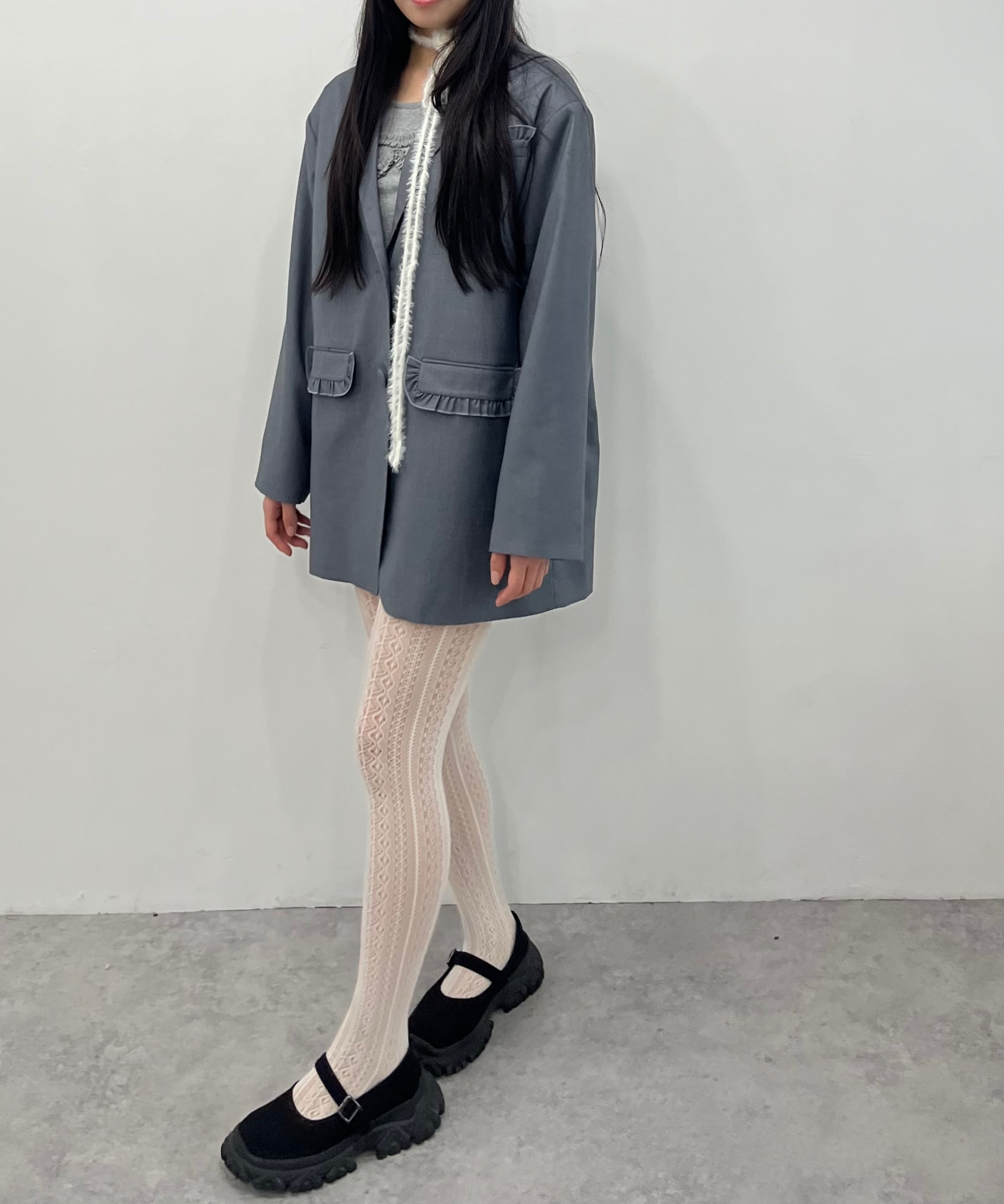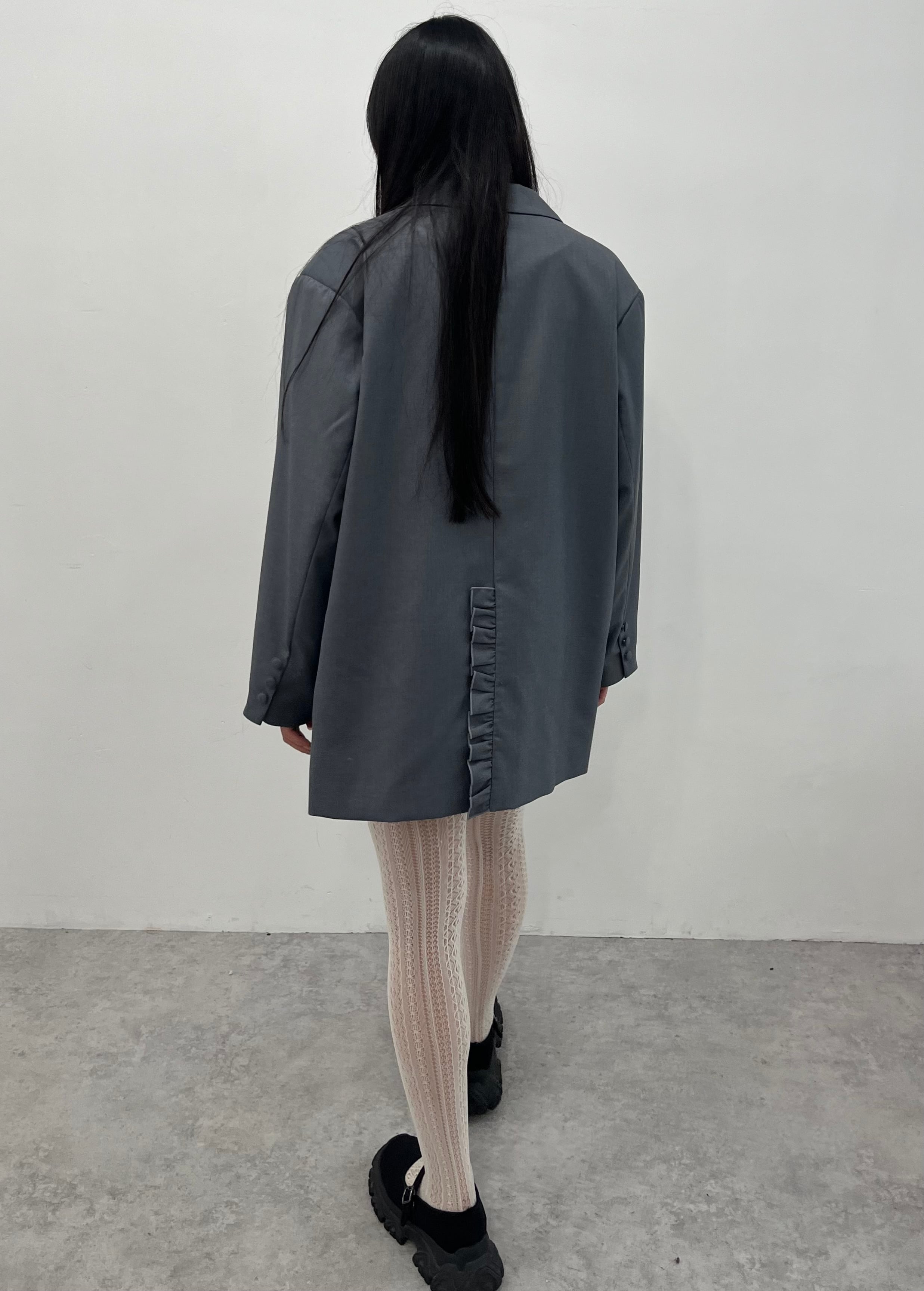 フリルディティールがポイントのオーバーサイズジャケットです。